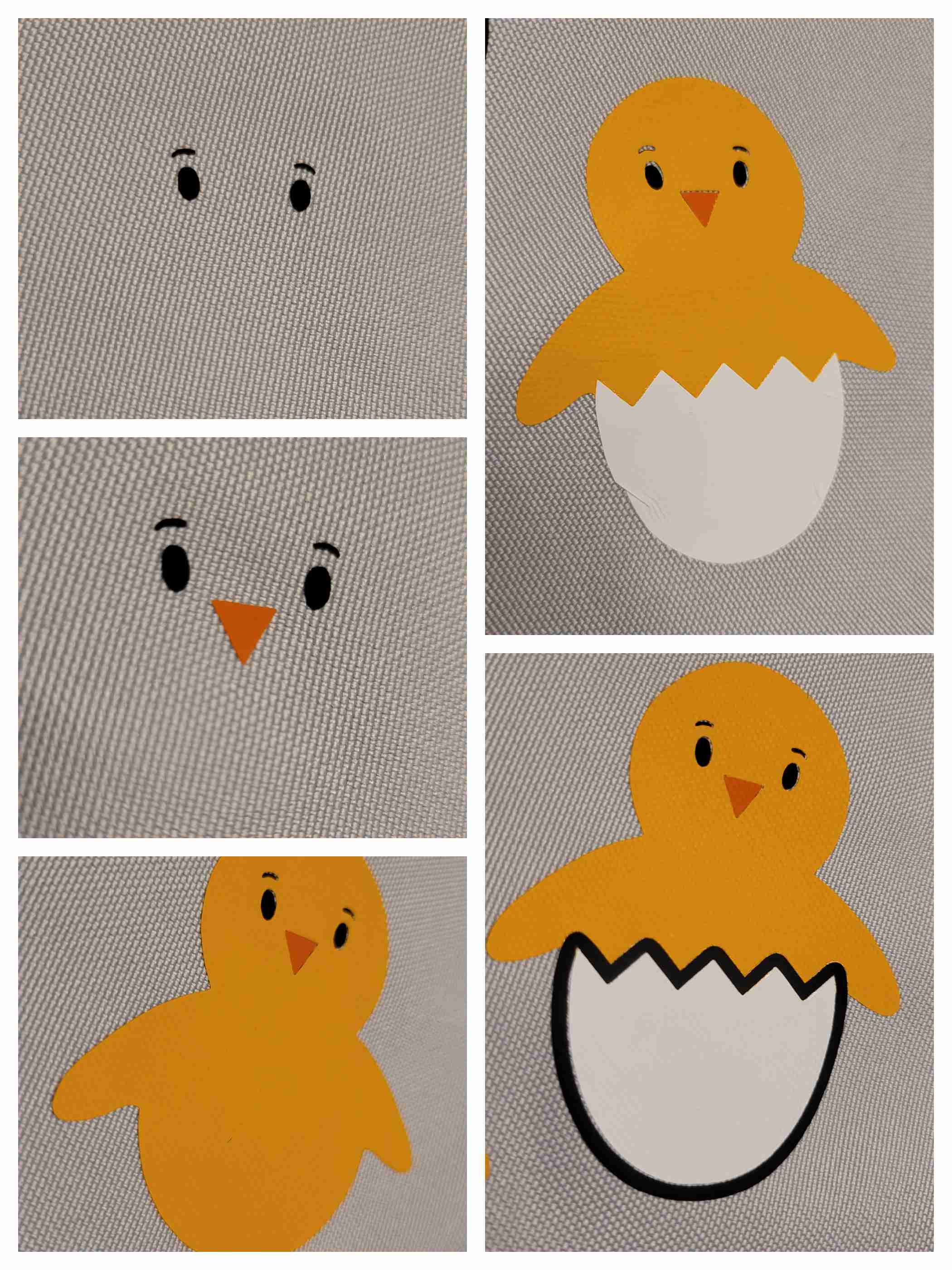 Dieses Säckchen habe ich in Schichten beplottet, da ich allein für die Küken einige Farben benutzt habe: gelb, orange, weiß und zwei mal schwarz.