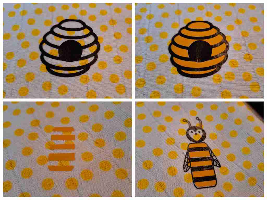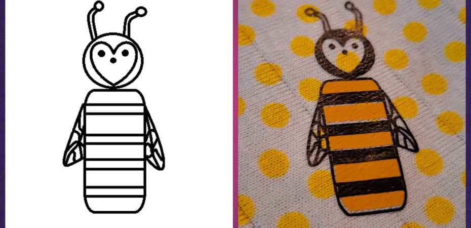 Also habe ich mich drangemacht. Mit dem „Paint“ Programm auf dem Laptop entstand das Bienchen. Ein paar geometrische Formen, ein Herz und einige Striche und Kurven und schon war das Bienchen fertig.