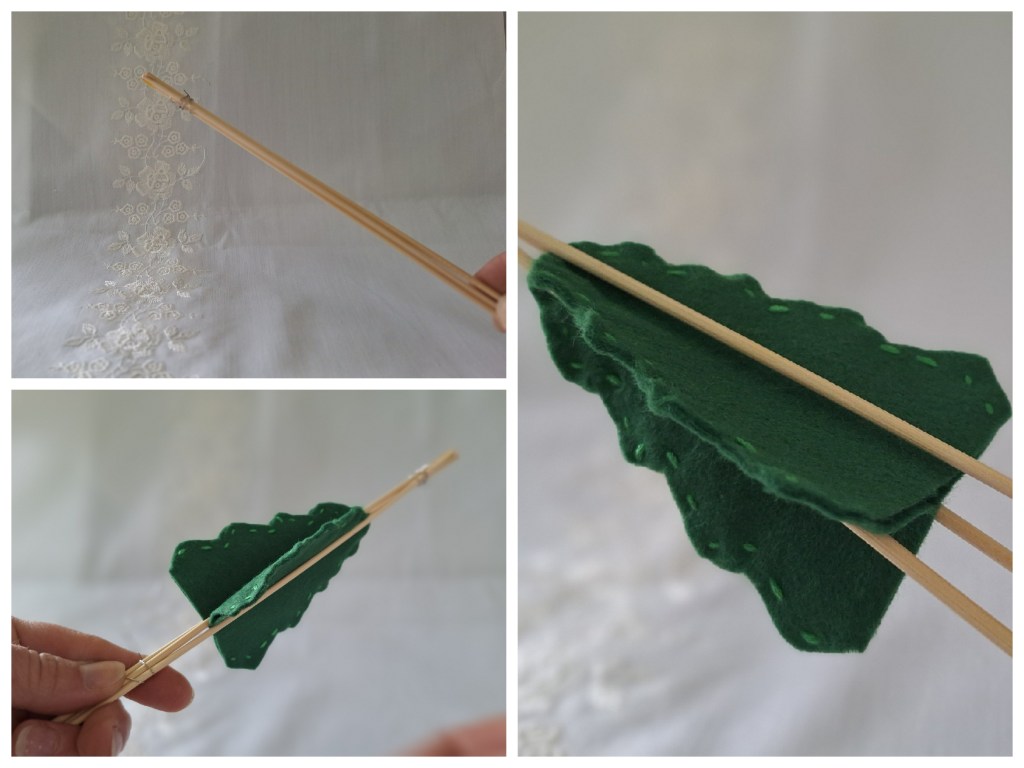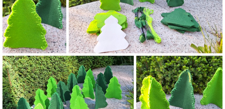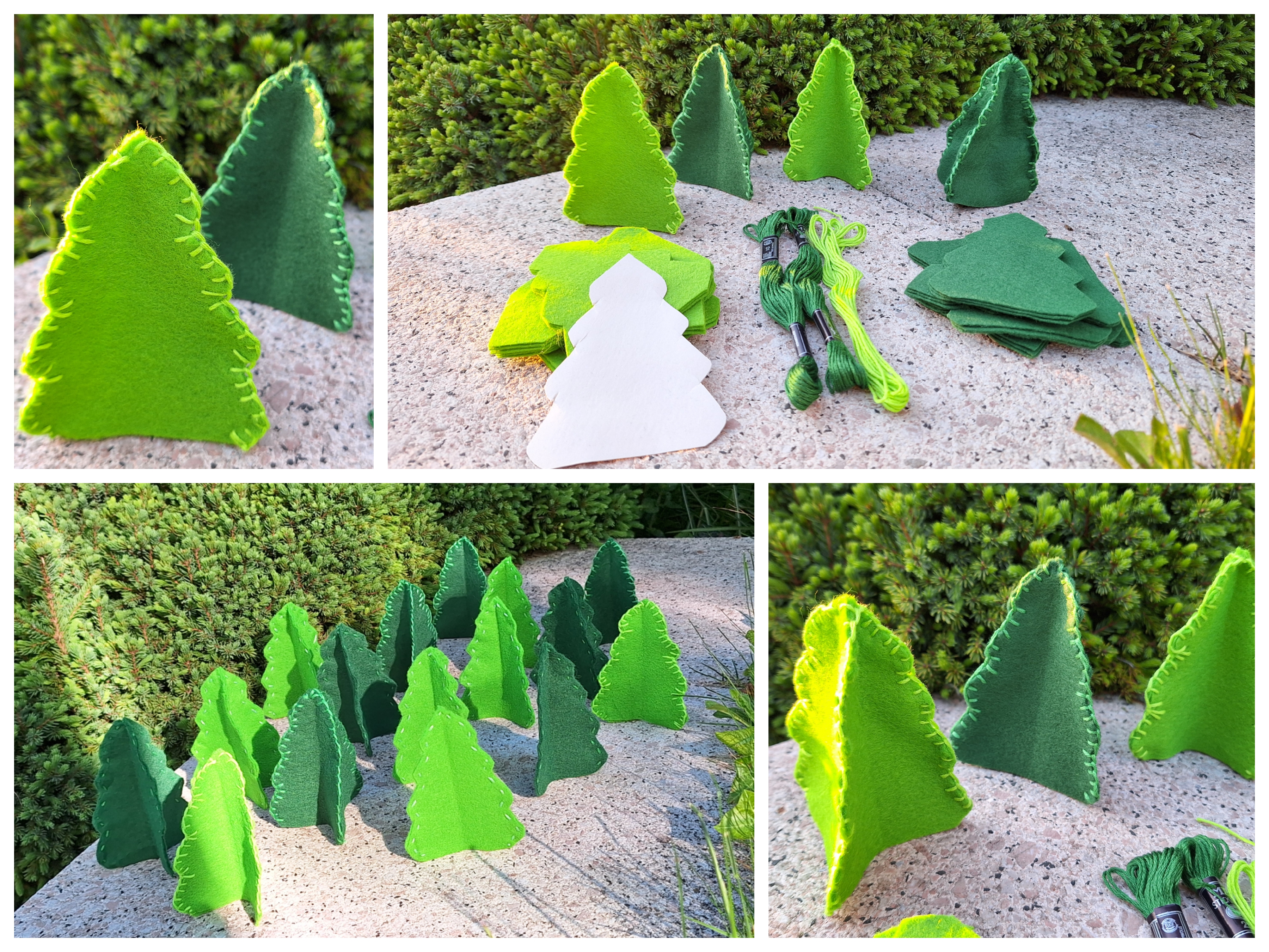 Ich habe alles, was ich an grünem Filz (1mm) da hatte, zusammengesucht und habe immer 3 Tannen ausgeschnitten. Diese wurden dann mit Stickgarn zusammengenäht.
