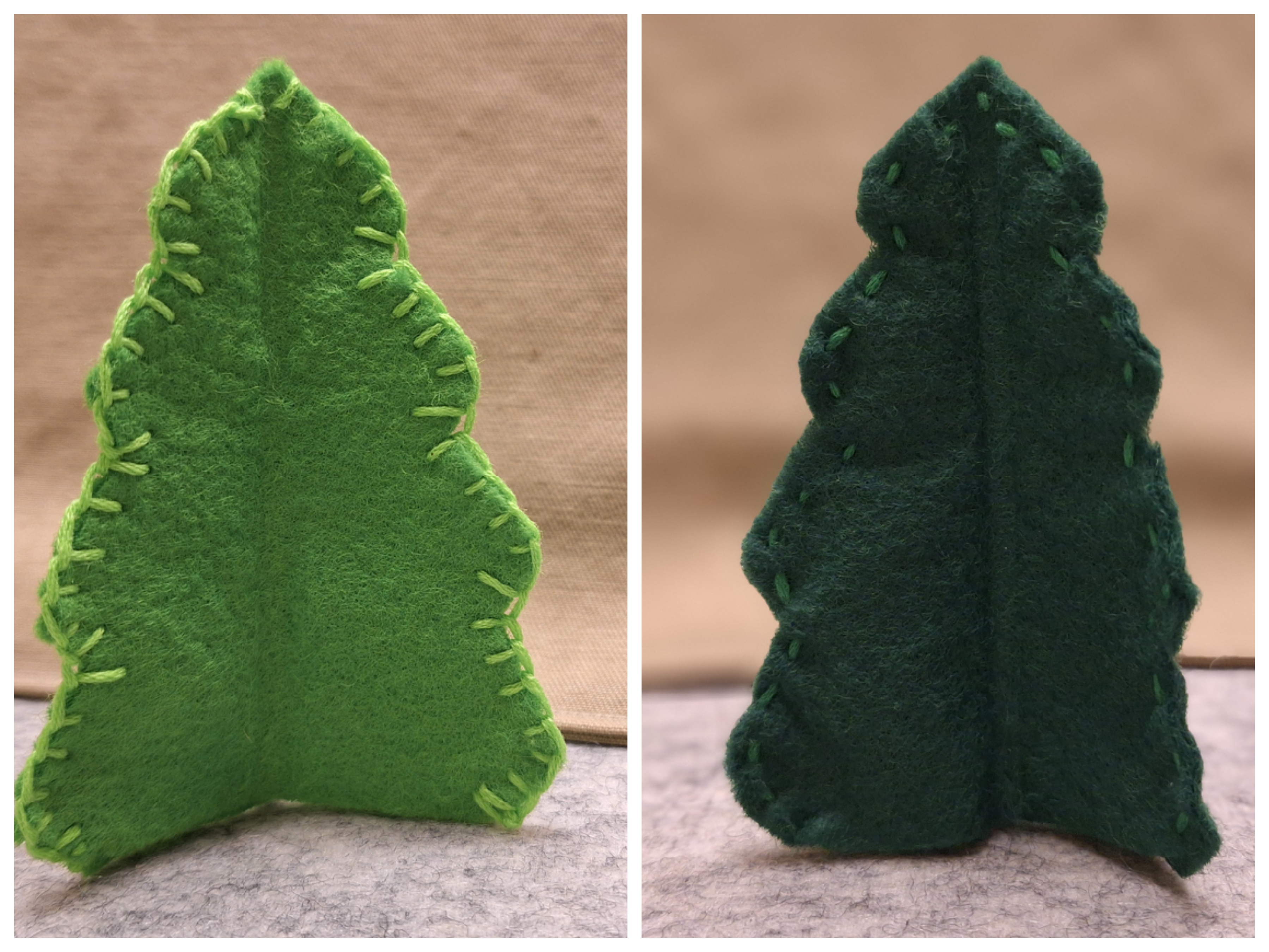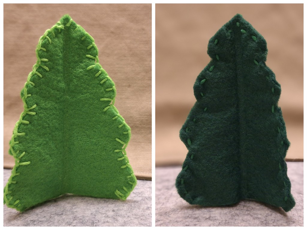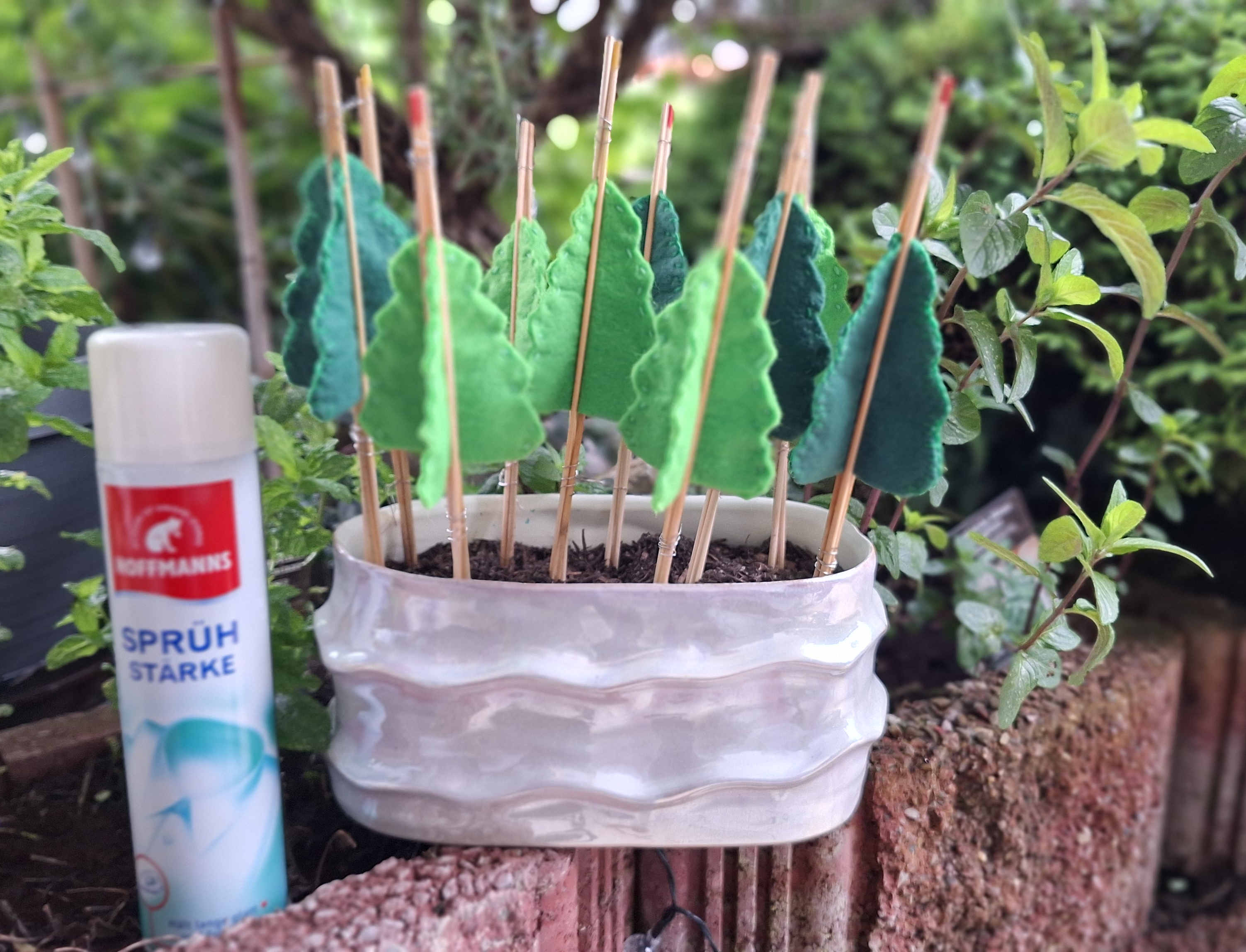 Nachtrag: Während des Schreiben dieses Beitrages, habe ich bemerkt, dass ich die Bäume bis zur Mitte zusammen hätte nähen müssen. Ich habe jeweils von der Spitze bis zu den unteren Zweigen zugemacht. Diese Erkenntnis macht Sinn – vielleicht sind sie dann automatisch stabiler. Aber hey, Sprühstärke ist auch für sowas gut. Beim nächsten Mal nehme ich vielleicht auch einen etwas dickeren Filz…
