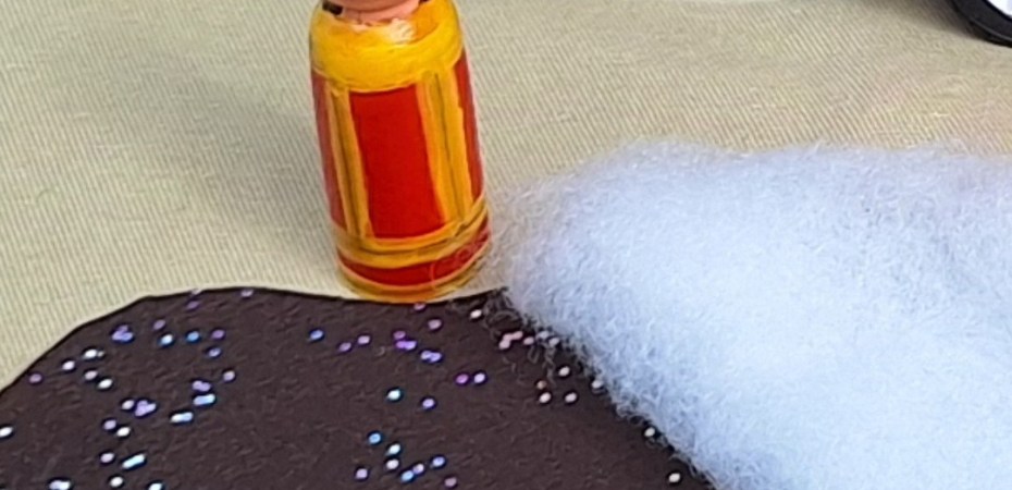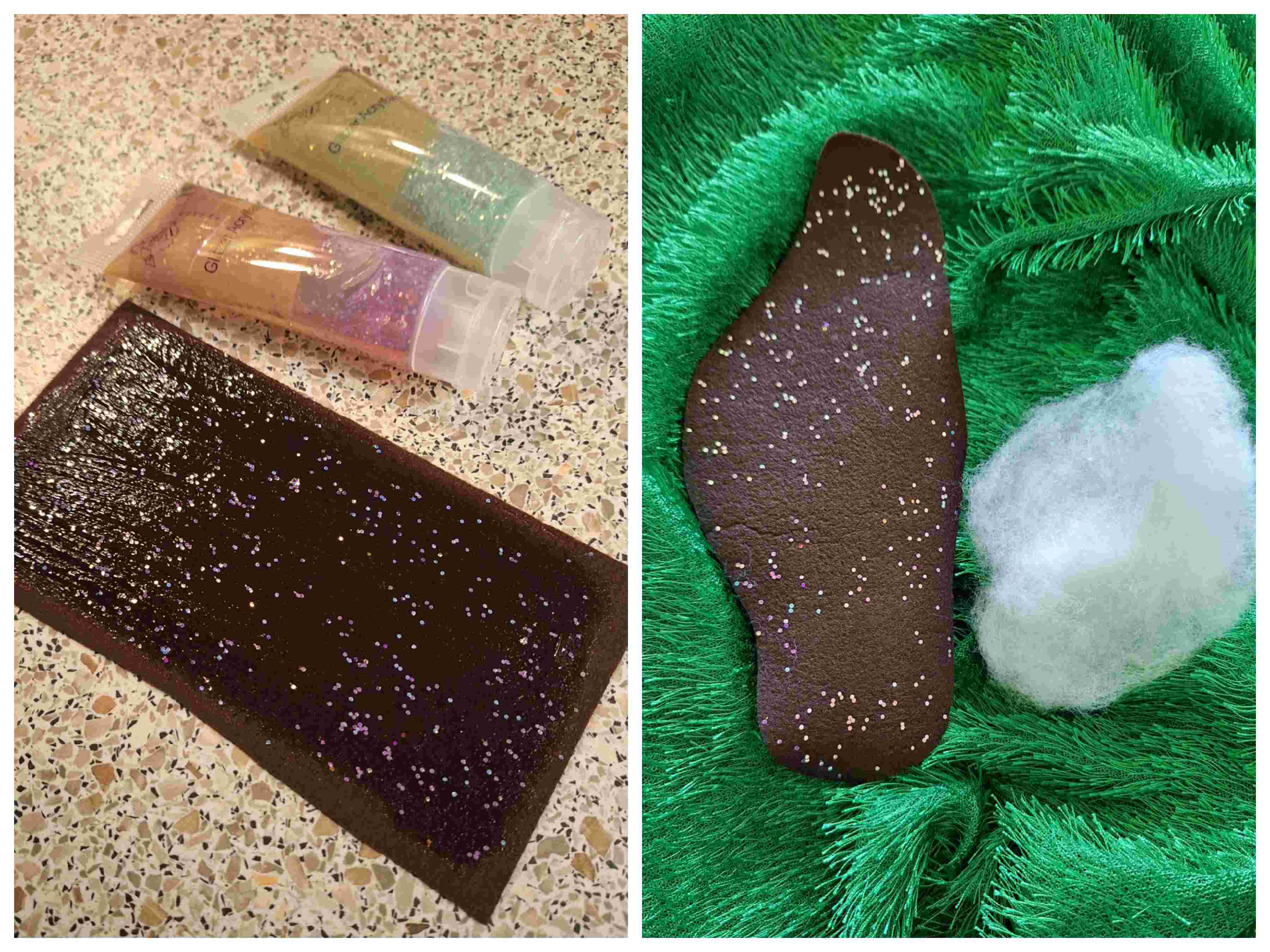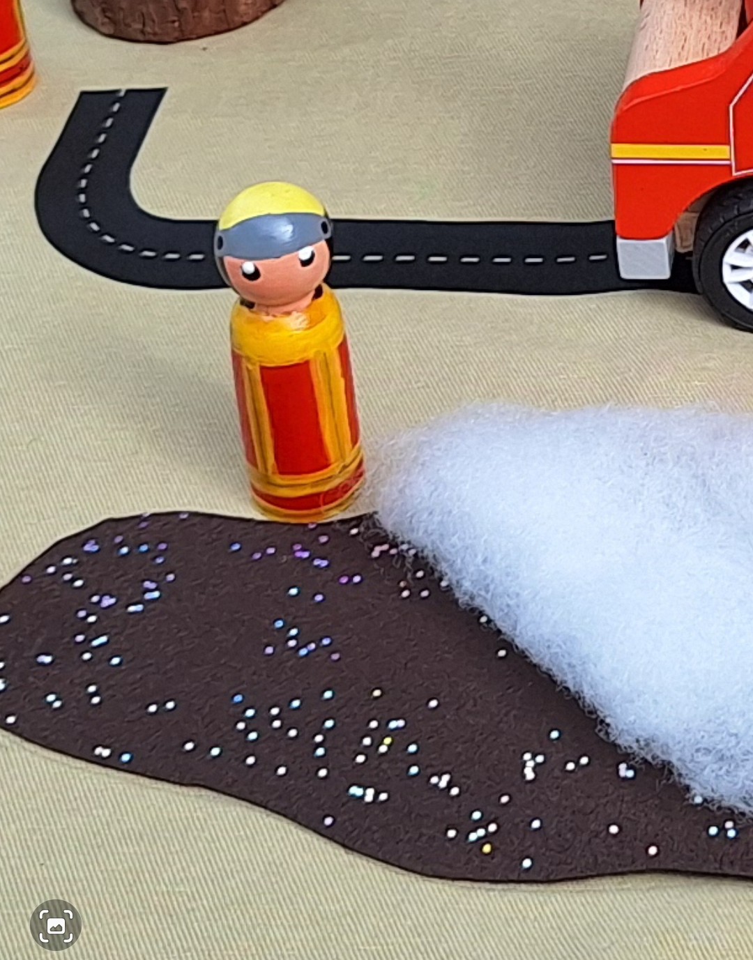Hierzu habe ich einfach ein Reststück braunen Filz (1mm)genommen und habe mit GlitzerAcrylfarbe den Ölschimmer dargestellt. Der Löschschaum ist einfach ein bisschen Füllwatte. Fertig – total unkompliziert…