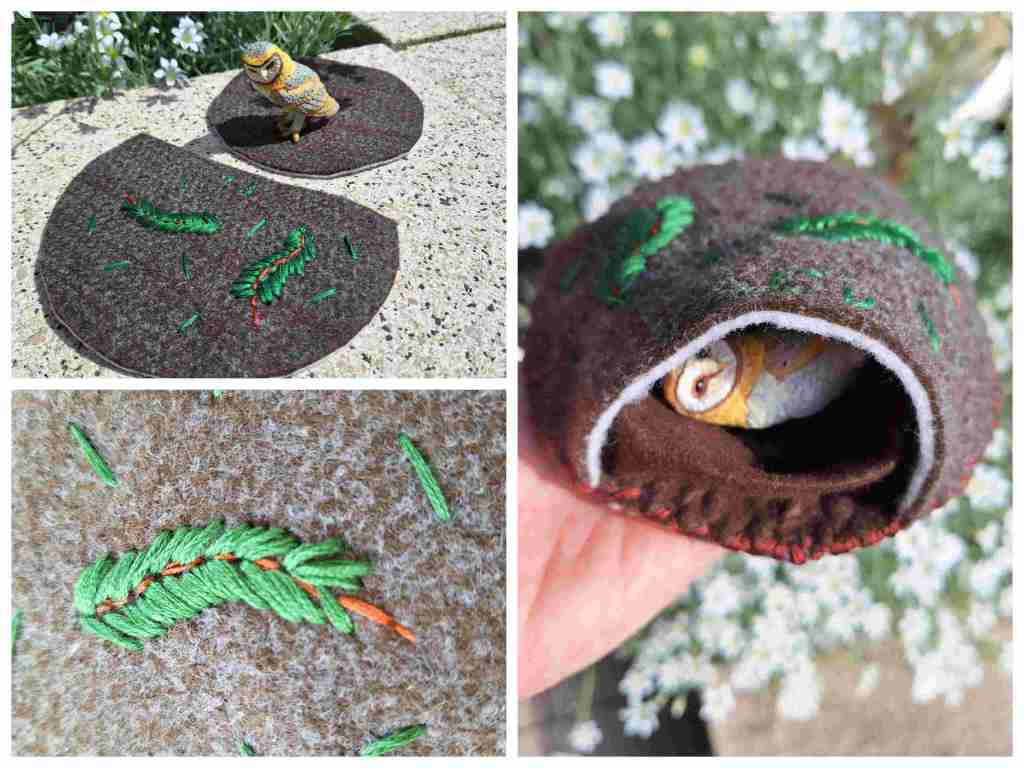 Ein Kreis als Boden (tatsächlich was das eine Müslischüssel) und als Höhlendach habe ich einen etwas größeren Kreis aufgezeichnet und davon ein Stück abgeschnitten. Nun hieß es zusammennähen. Doch dann hatte ich die Idee, die einzelnen Höhlen noch zu gestalten.