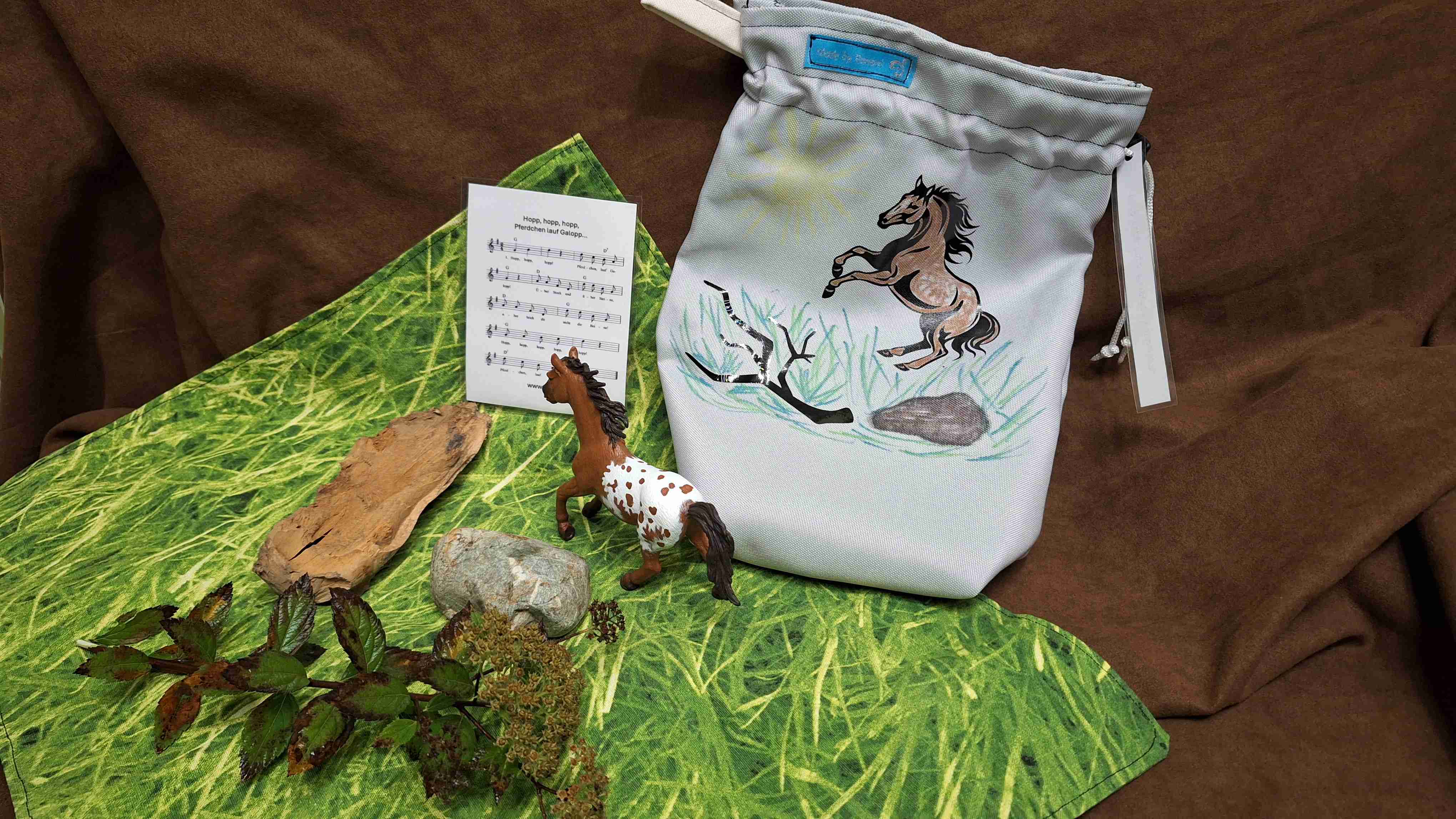 Also wieder zurück in den Laden um das Pferd zu besorgen, den Rest hatte ich zu Hause – also die Stoffe für den Boden und das Säckchen. Stein und Stock waren Natur – Fundstücke.