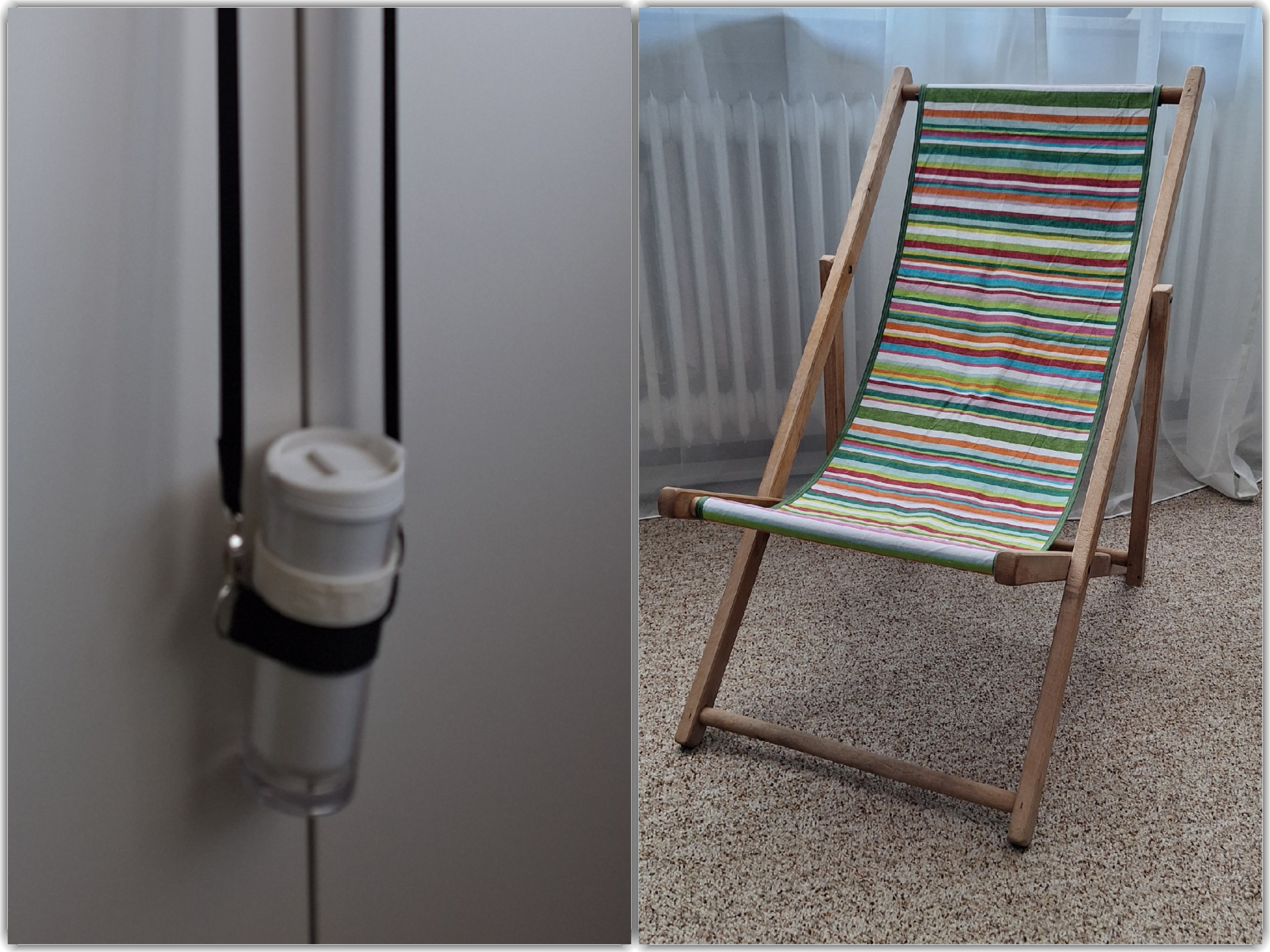 Eine Halterung für den Thermobecher —– Kaputten Stuhl von Freunden repariert.