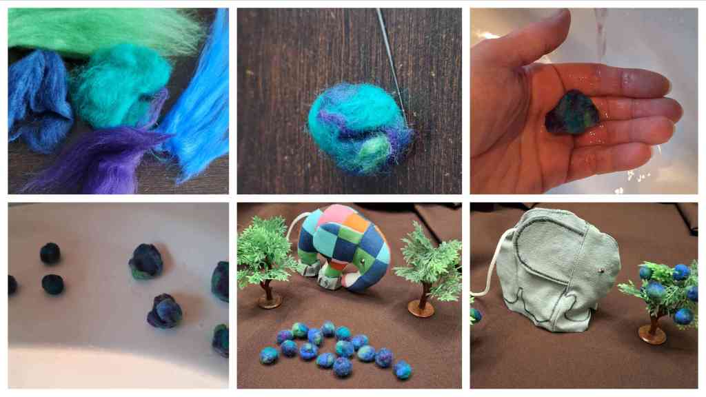 Elmar, sucht in der Geschichte nach einem Beerenbusch. Die Bäume und die Büsche habe ich über einen Asiamarkt erworben – damit sie besser stehen können, habe ich sie noch zusätzlich auf einen Holzscheibe geklebt und aus Märchenwolle bekamen die beiden kleinen Sträucher/Bäumchen Beeren reingeklebt. Diese habe ich nass gefilzt. Ging nämlich schneller :-).