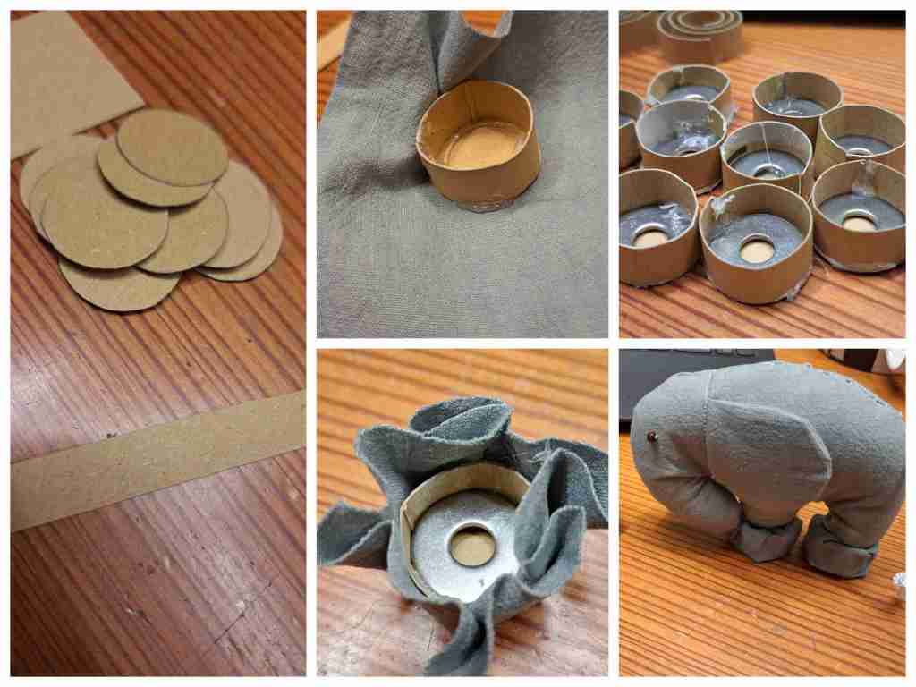 Dann waren die anderen Elefanten dran. Ich hatte mich entschieden 5 davon zu machen. Gleiche Anleitung, gleiches Material, außer dem Stoff. Dieser war mal ein altes Leintuch (von früher), das mal eingefärbt wurde. Festere Baumwolle.
