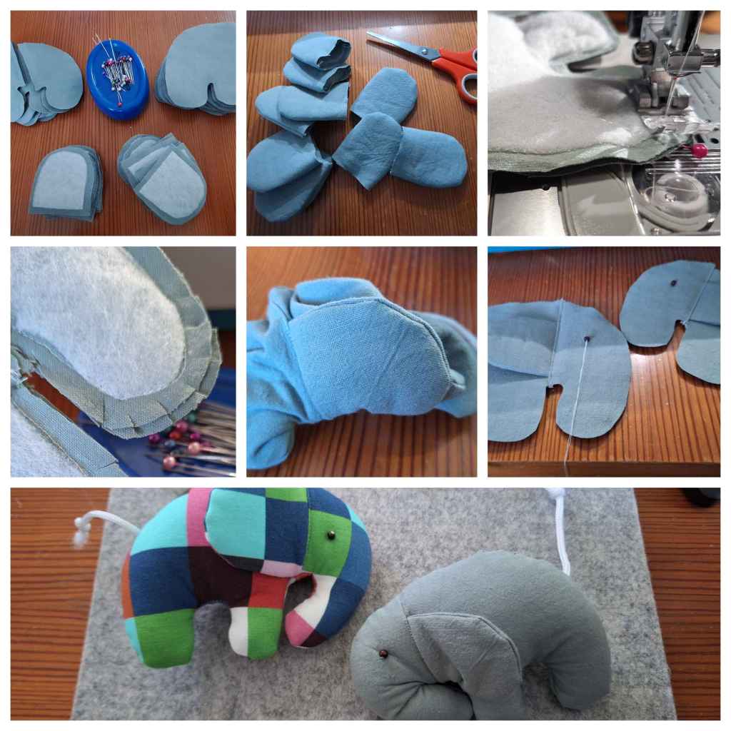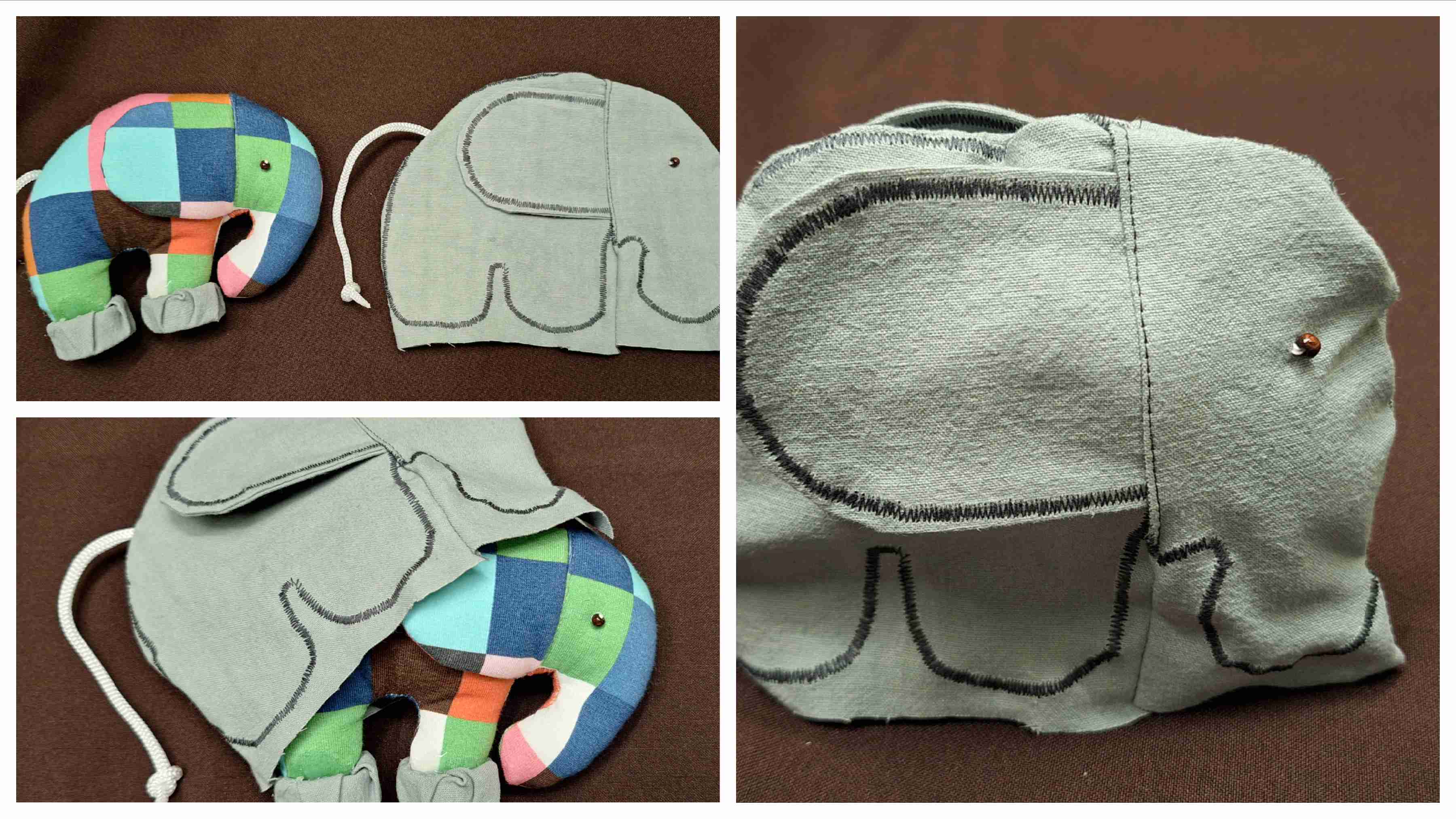 Elmar wälzt sich in den Beeren und wird auch elefantenfarben. Hier habe ich wie einen Überwurf zusammengenäht – in dem Stoff der Elefanten. Es ist nicht perfekt, aber erfüllt seinen Zweck!