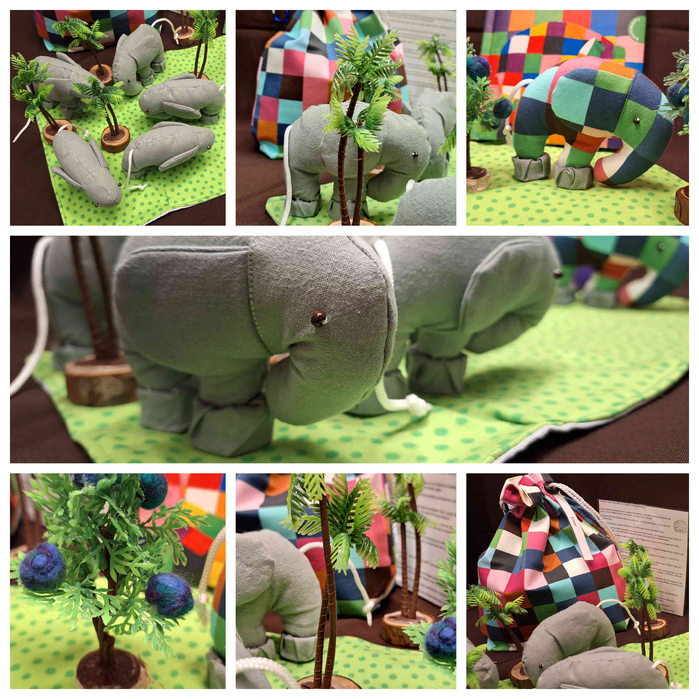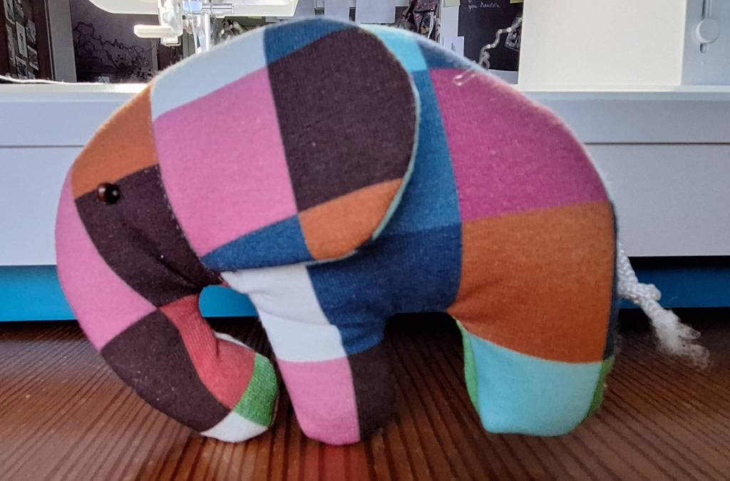 Gestartet hatte ich vor längerer Zeit mit dem Säckchen dazu. Erstellt nach meiner Anleitung und in den Schrank gelegt. Ich weiß leider nicht mehr wo ich den Stoff gefunden habe – er hat auch nicht alle von Elmars Originalfarben, daher habe ich den Text an der Stelle etwas verändert und auch passend für mich gekürzt. Wer jedoch das Internet nach Stoff Elmar durchforstet, findet auch Stoff, der zu 100% passt. Es gibt auch Elmar Kuscheltiere.