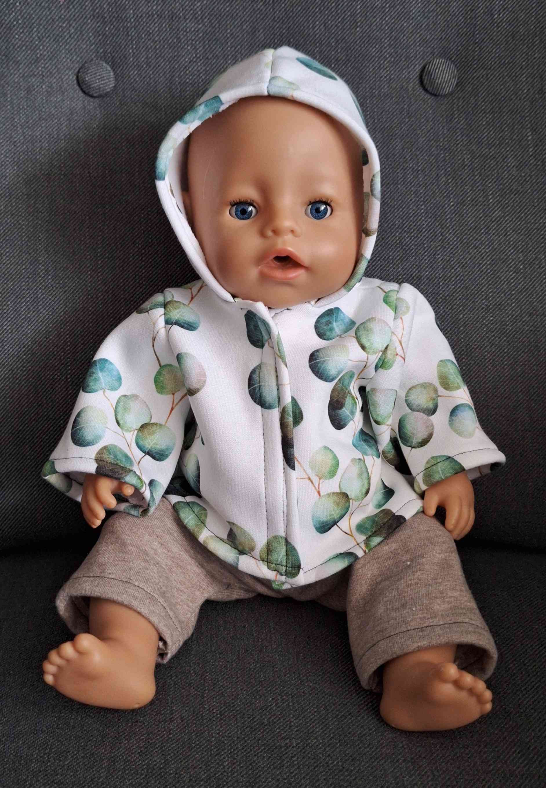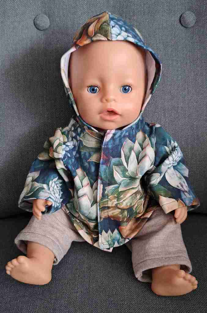 Die Baby Born hat die „lange Hose“ zu den Kapuzenjacken an, die auch in diesem Schnittmusterset zu finden ist.