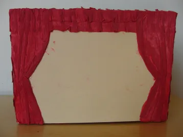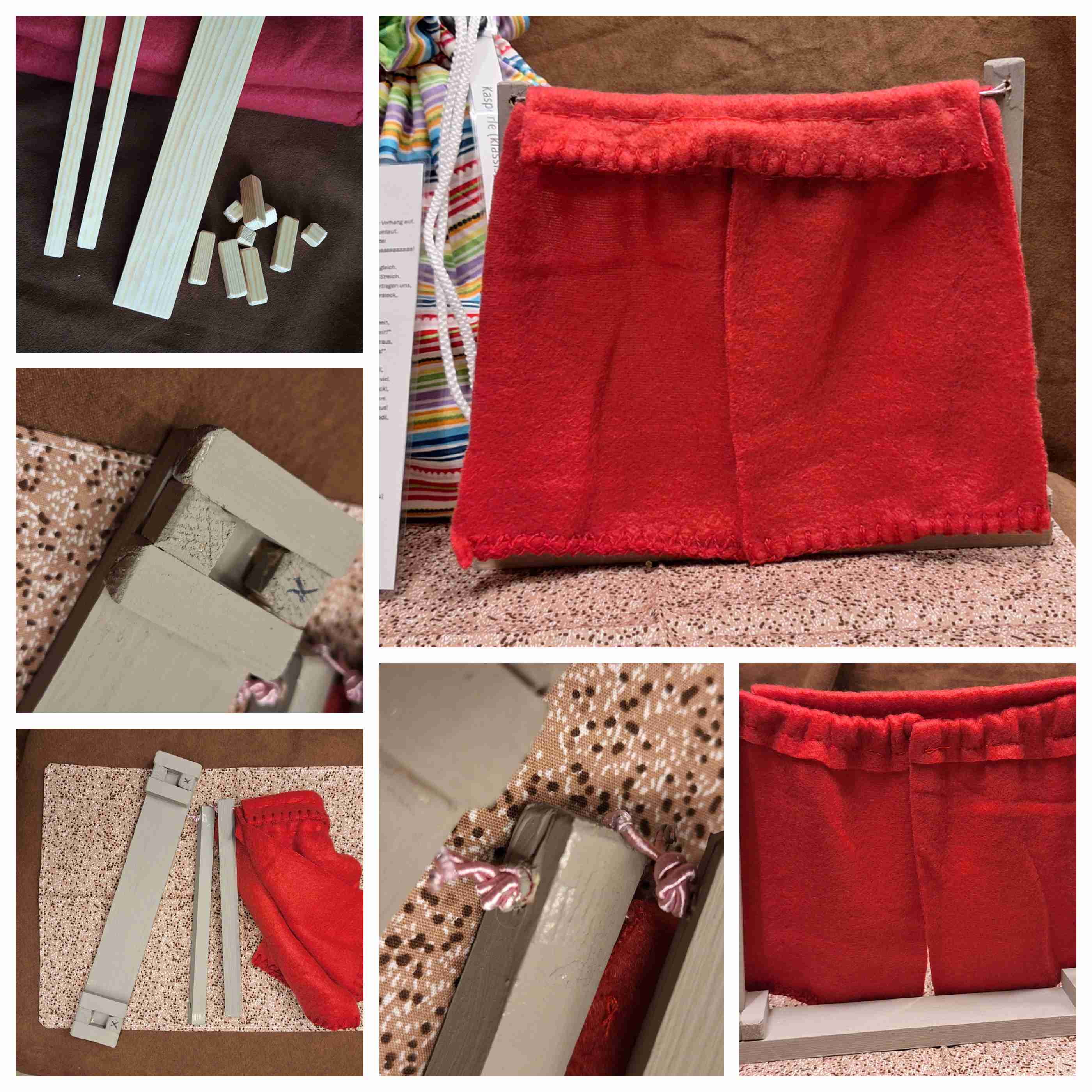 Die Bühne (dient dazu, dass das Spielfeld nicht so leer ist und man kann auch den Vorhang verschieben – wie im Fingerspiel) besteht aus Kanthölzern (gesägt und mit Holzleim geklebt, Löcher reingebohrt). Das ganze Konstrukt habe ich noch angemalt und aus einer alten FleeceDecke den Vorhang hergestellt und auf die Fäden gezogen.