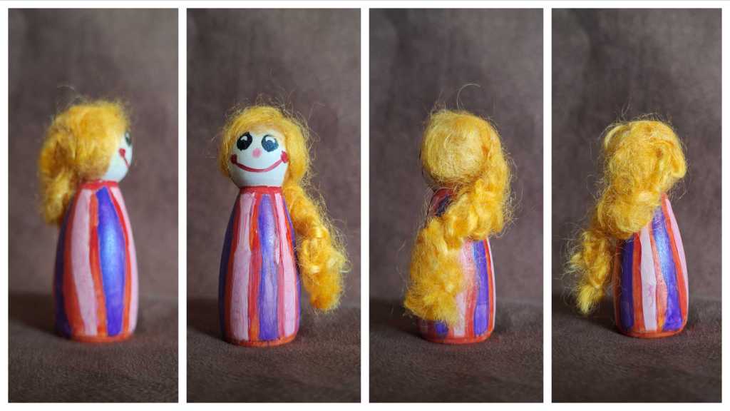 Die Haare sind aus Märchenwolle gemacht. Geflochten, etwas gefilzt – man kann erkennen, dass mich irgendwann die Lust verlassen hat. 100% zufrieden bin ich nicht, aber es ist ok. Nur mein innerer Monk sagt: „Das kannst du besser!“
