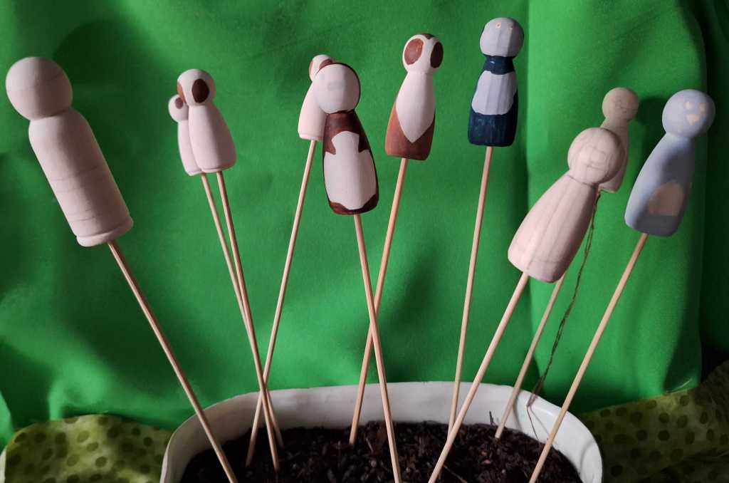 Um besser Malen zu können, mache ich immer eine Bohrung in den Boden der Figur und setzte die PegDolls auf Schaschlik Spieße. In einem Blumentopf, habe ich etwas Erde drin – da ist mein zwischen – Parkplatz, während dem Trocknen.