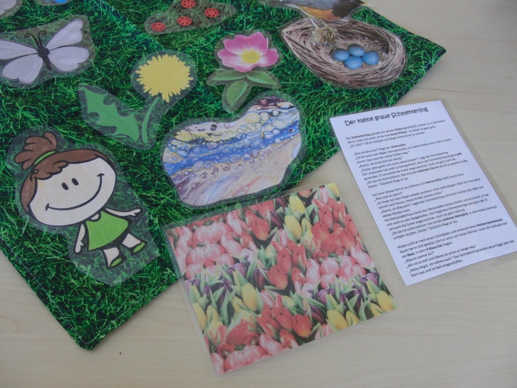 Dann brauchte ich die ganzen Bilder, die ich einlaminiert habe. Den Schmetterling, in den verschiedenen Stadien, den Löwenzahn, den Marienkäfer, die blauen Eier, die Blumen, das Mädchen, etc. Diese habe ich im Netz zusammengesucht.