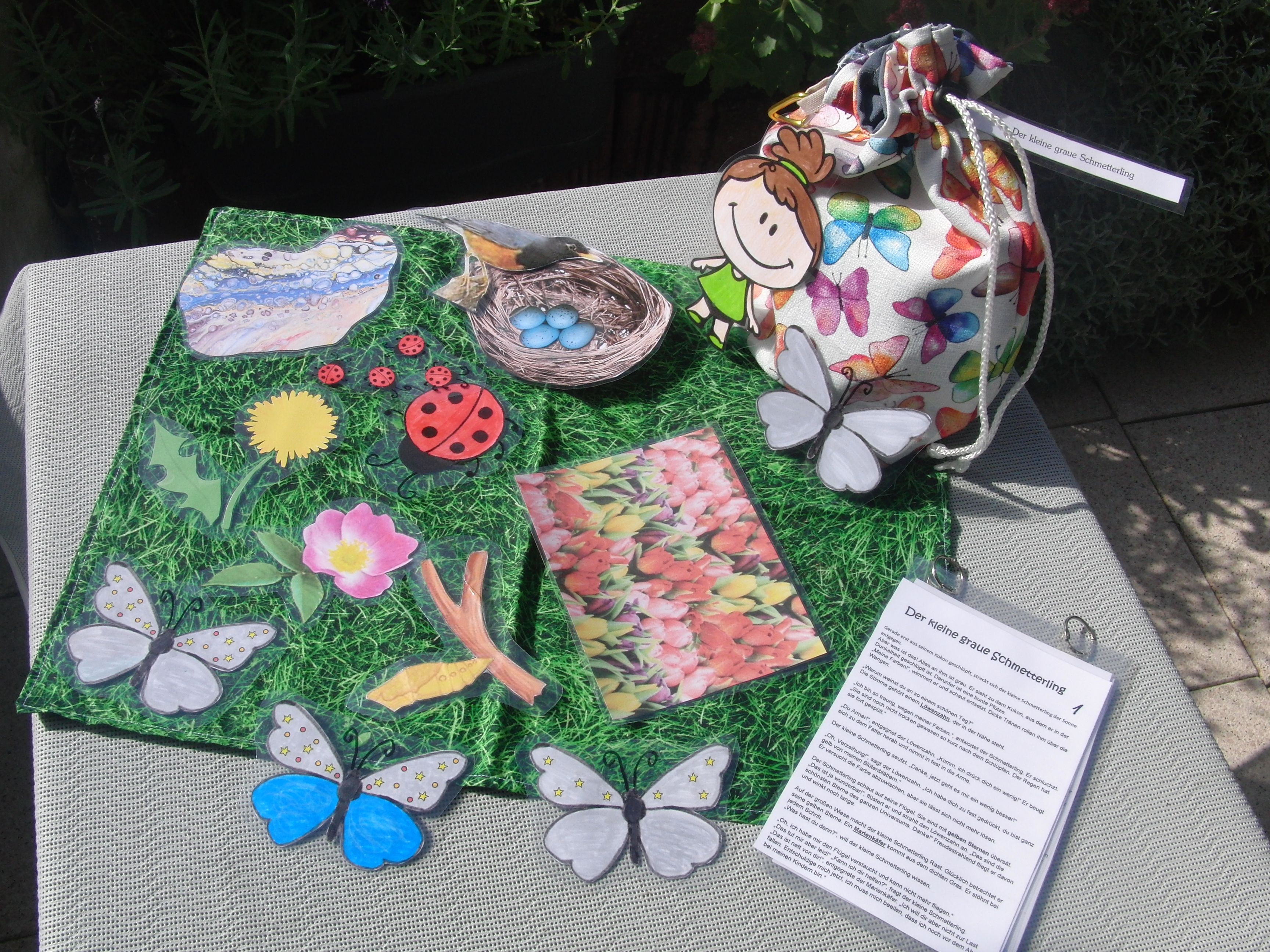 Die Originalversion stammt von der Seite hier: https://www.leselupe.de/beitrag/der-kleine-graue-schmetterling-133766/ Ich habe den Text für das Säckchen etwas gekürzt, weil er doch ganz schön lang ist.