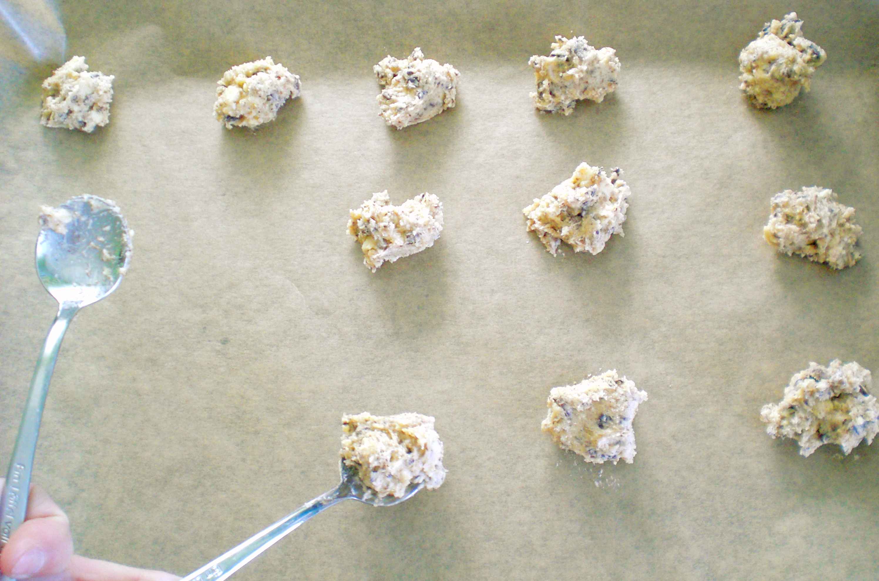 Nicht zu große Haufen, Abstand halten… und bei 180°C für ca. 15 Minuten in den Ofen.