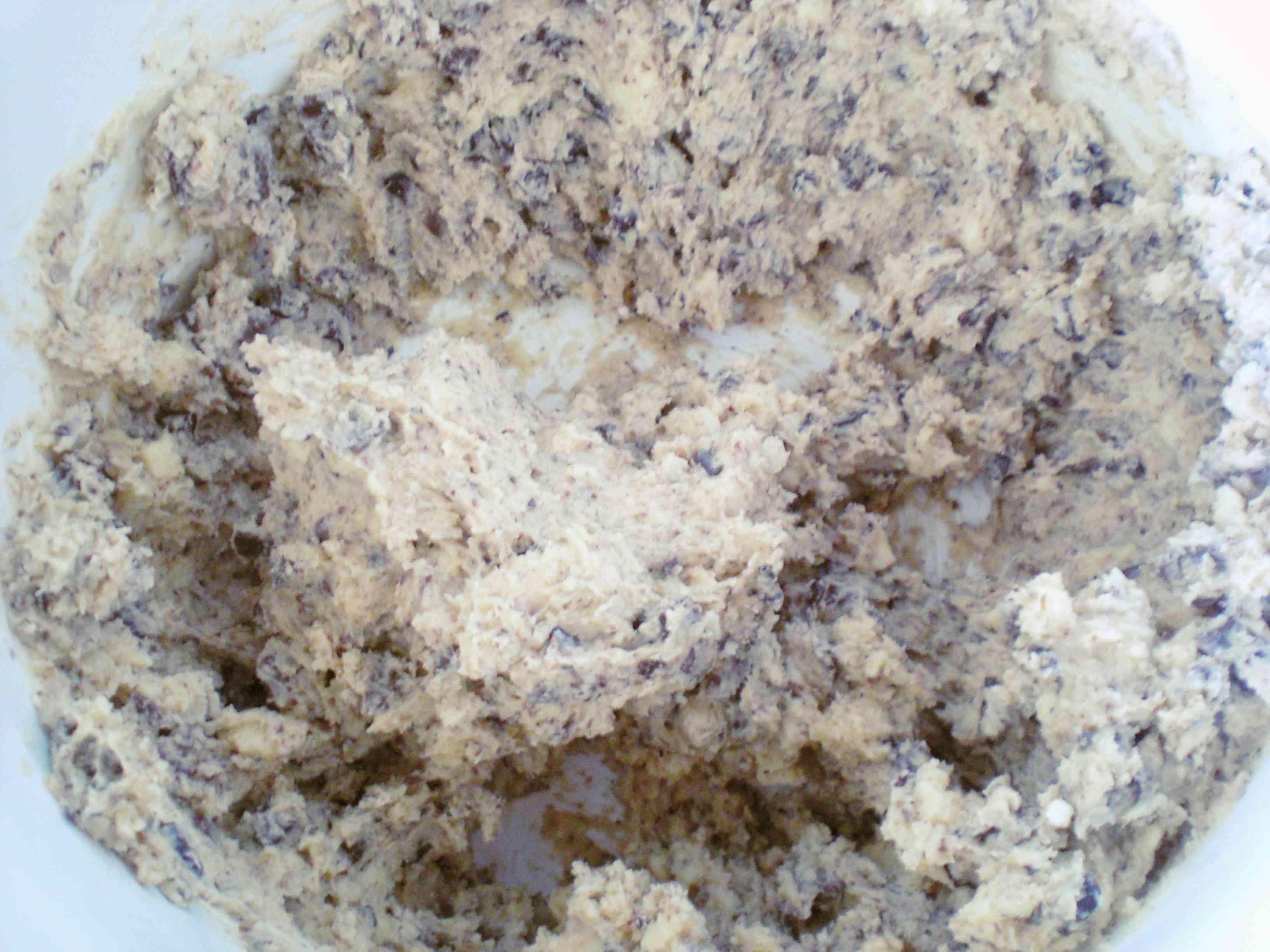 Also alle Zutaten auf einmal in die Schüssel, vermischen und ab aufs Blech.