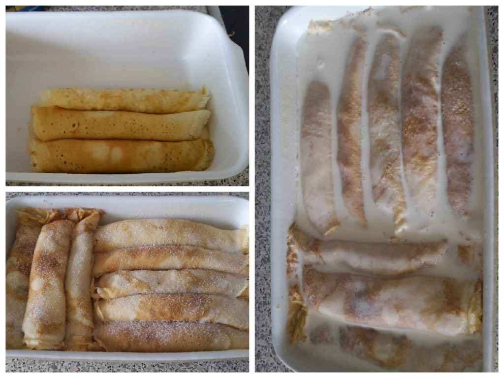 Form mit einer Lage gefüllten Pfannkuchen auslegen, mit Zucker bestreuen. Wenn die Auflaufform voll ist ( 2 Schichten mit je 8 Pfannkuchen), nochmal etwas Zucker verteilen. Anschließend die Sahne (250g) verteilen – die Pfannkuchen „schwimmen“.*