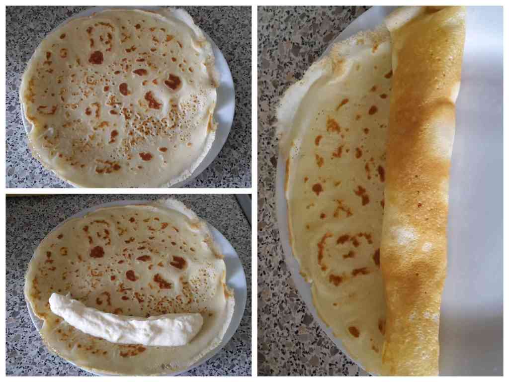 Pro Pfannkuchen, sollte nun ca. 1 EL Creme rein und den Pfannkuchen anschließend ganz normal aufrollen.
