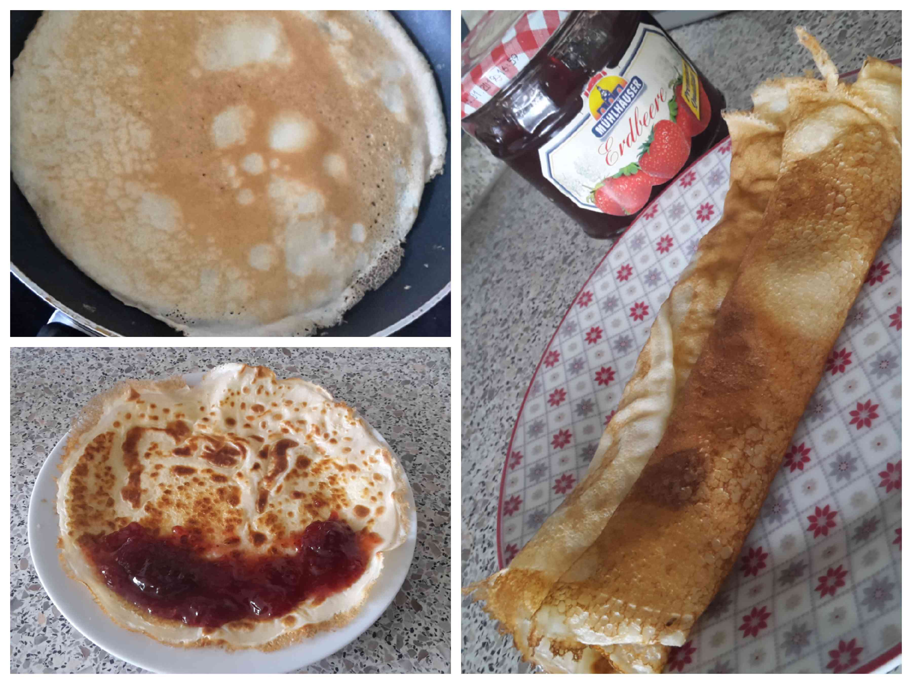 Nun ich schaffe es kaum genug Pfannkuchen zusammen zu bekommen. Denn, ich mag sie auch einfach – nur mit Erdbeermarmelade…