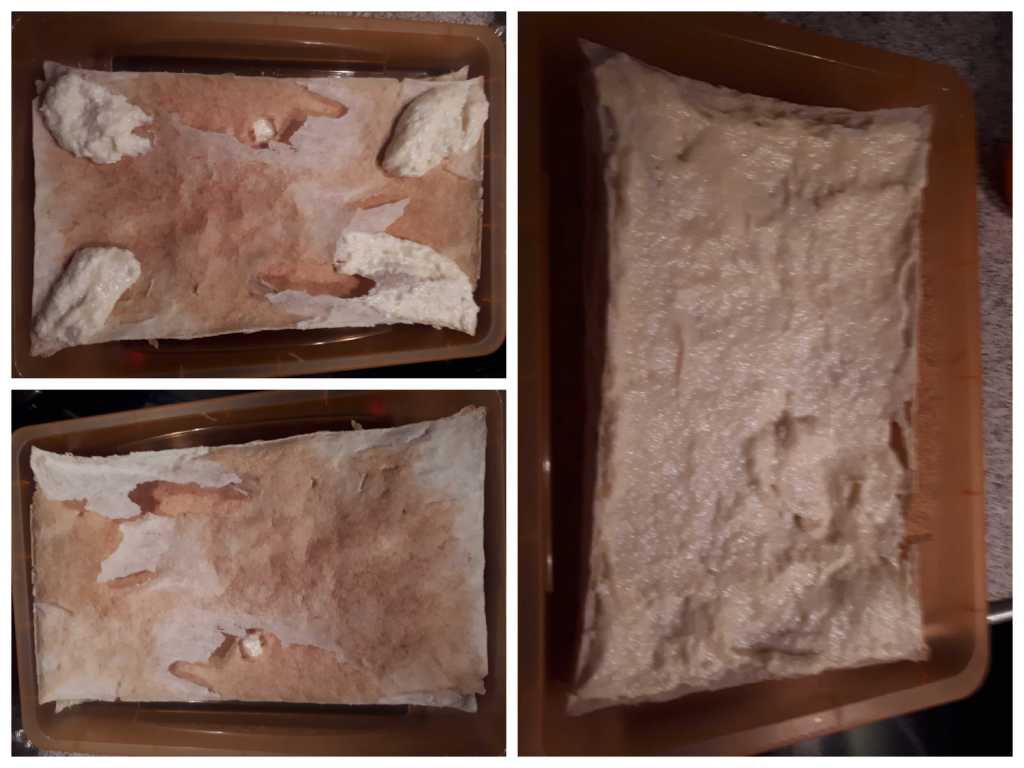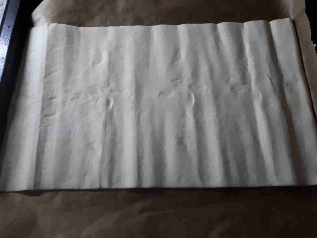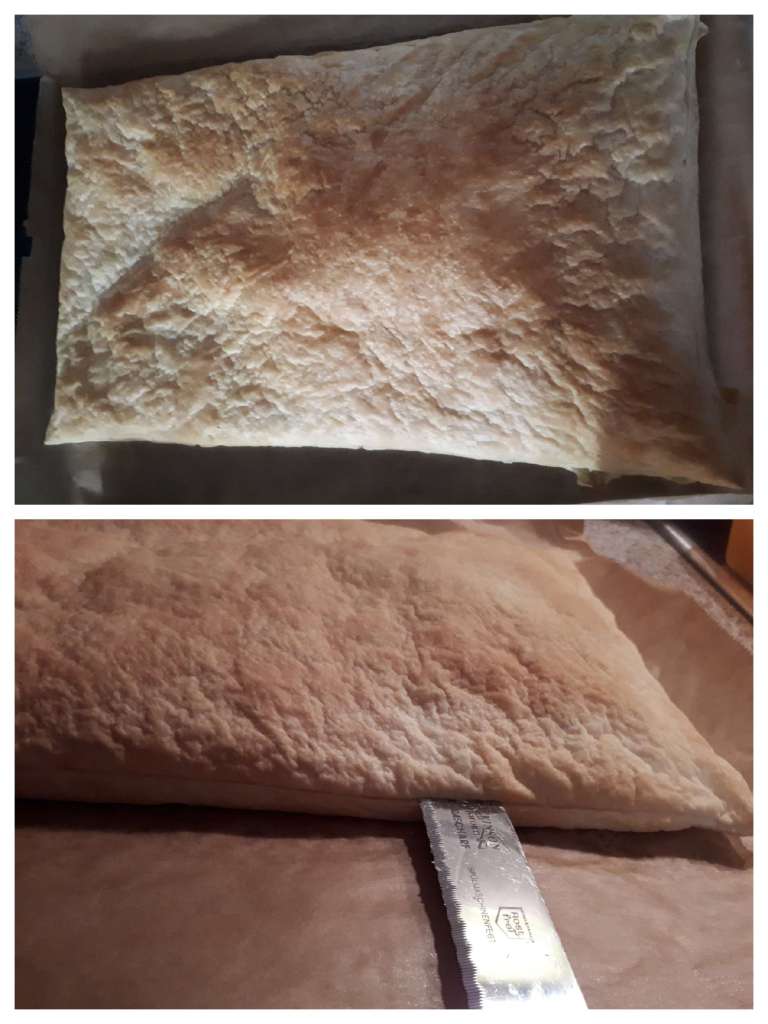 Den Blätterteig jeweils auf ein Backblech legen und ausbacken bis der Teig gold-gelb ist (früher hatte ich ihn noch mit einer Gabel eingestochen, mittlerweile jedoch nicht mehr). Während des Backens steigt der Teig. Nach dem Abkühlen, den gebackenen Teig vorsichtig durchschneiden.