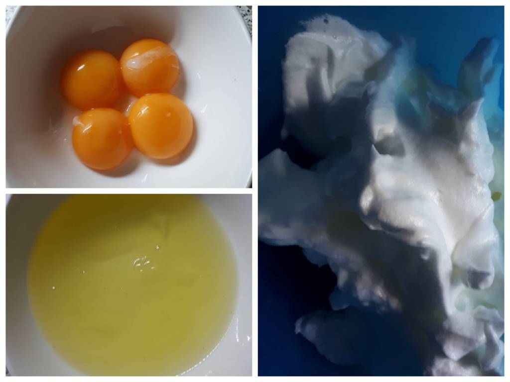 Eier trennen, das Eiweiß zu steifem Schnee aufschlagen, dabei 2 EL Zucker (von den 180g) einrieseln lassen. Kaltstellen.