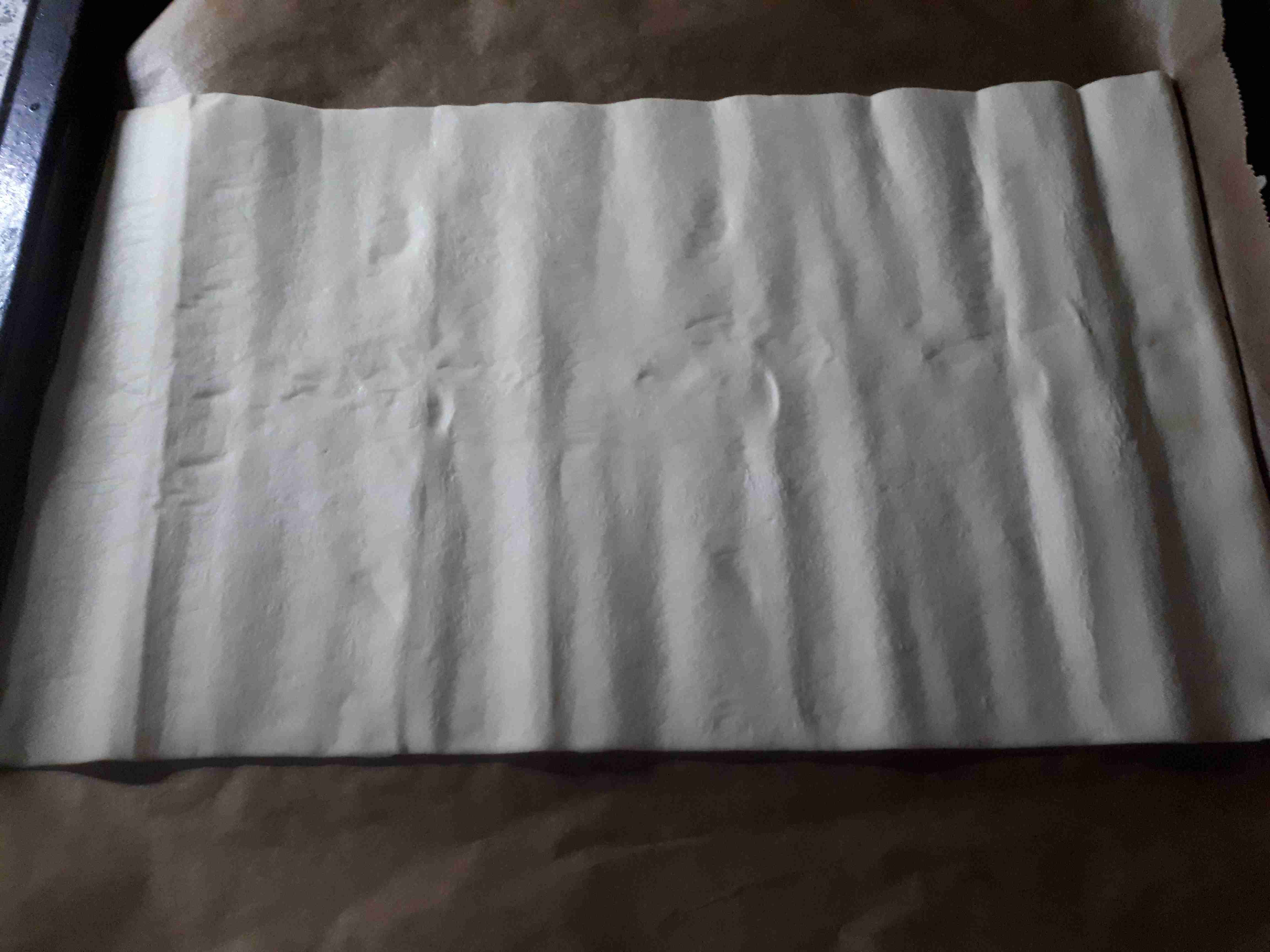 Den Blätterteig jeweils auf ein Backblech legen und ausbacken bis der Teig gold-gelb ist (früher hatte ich ihn noch mit einer Gabel eingestochen, mittlerweile jedoch nicht mehr). Während des Backens steigt der Teig. Nach dem Abkühlen, den gebackenen Teig vorsichtig durchschneiden.