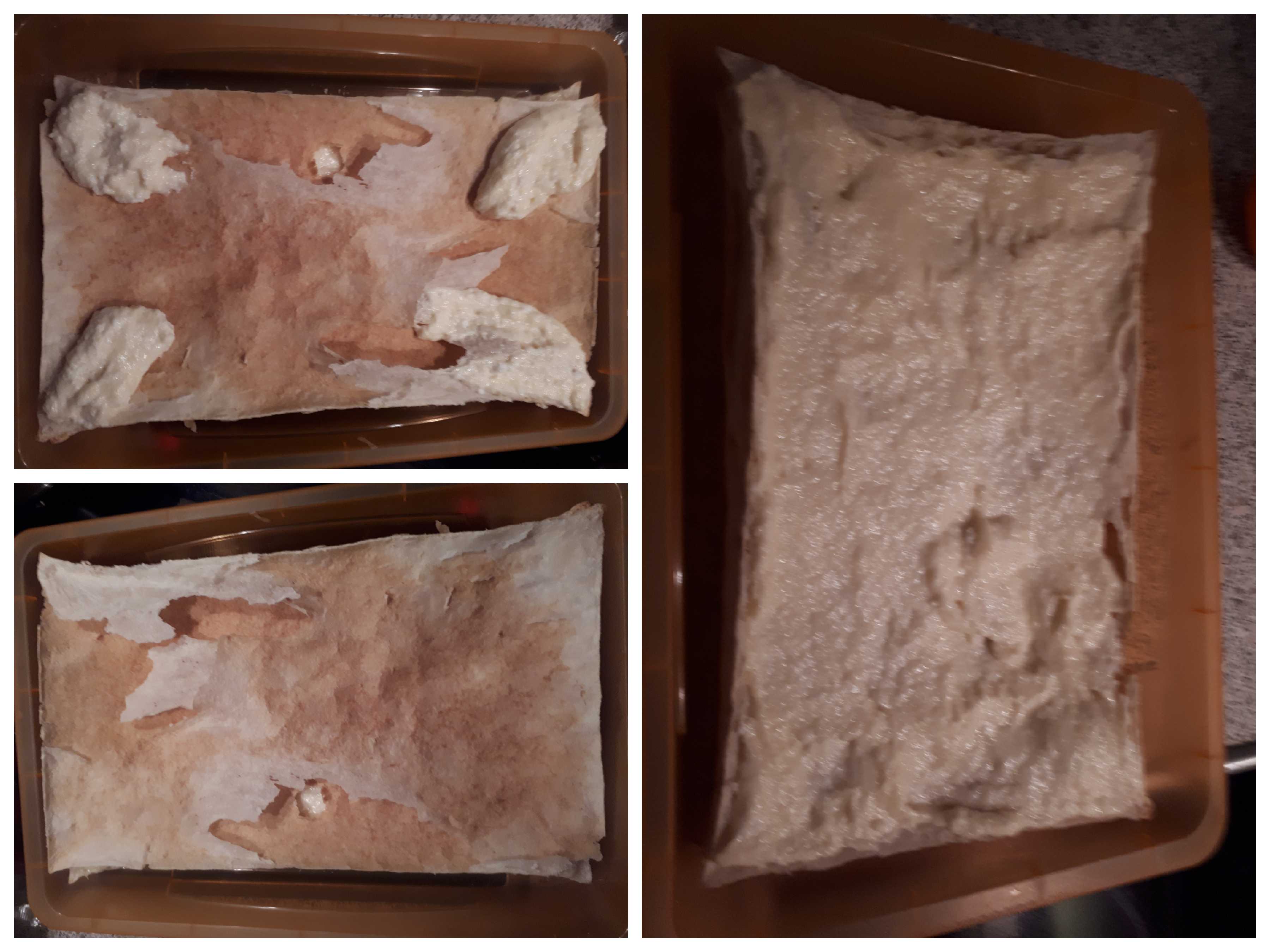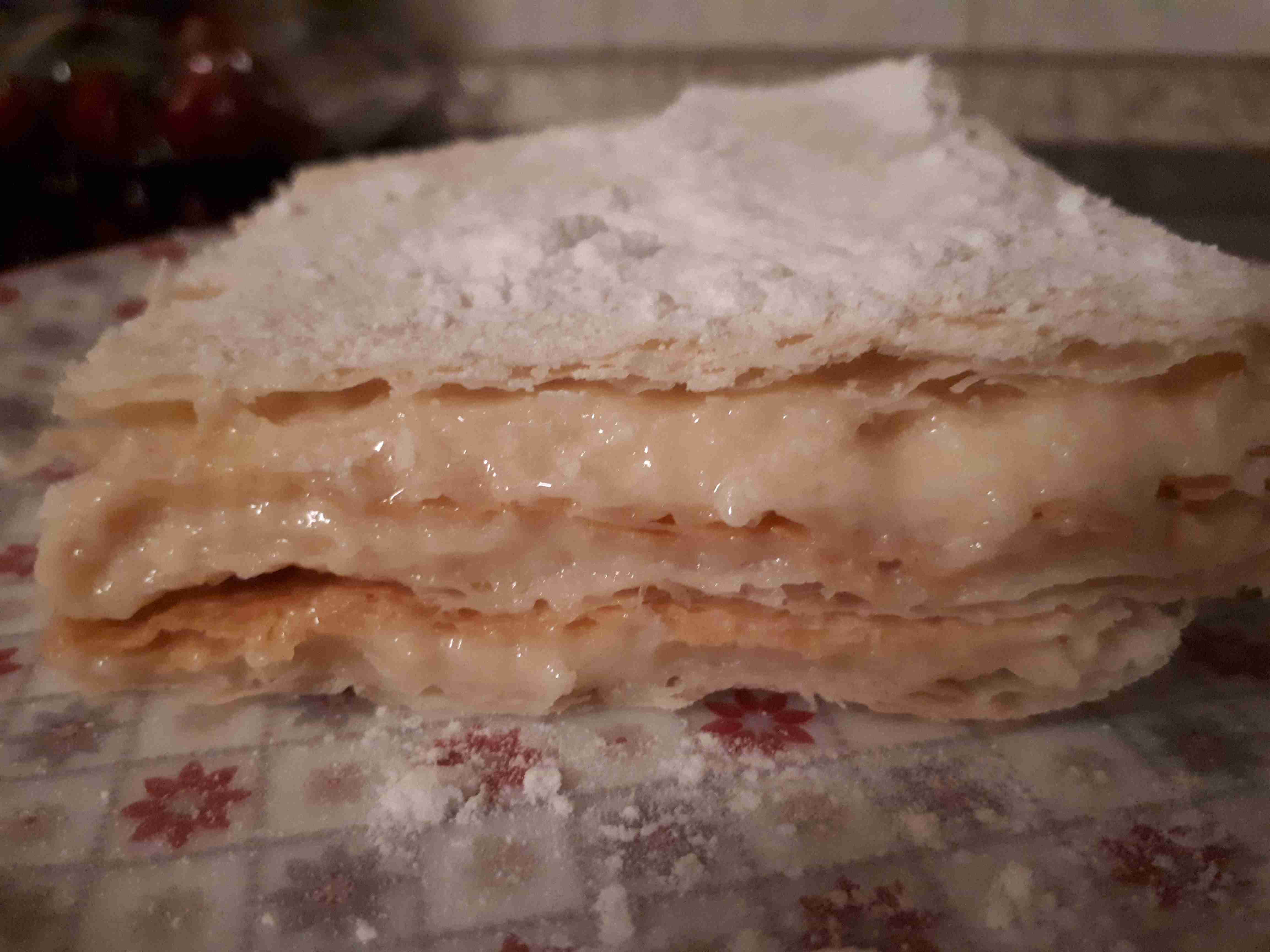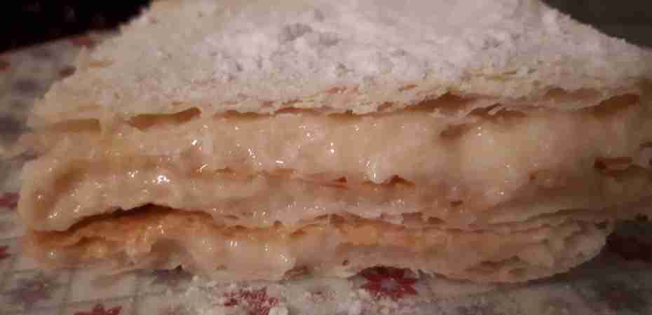Die Krempita muss nun (am besten über Nacht) kaltgestellt werden. Die Creme feuchtet die Blätterteig Teile durch und dadurch senken sich die hochstehenden Ecken. Am nächsten Tag liegen alle Seiten gleichmäßig flach an.