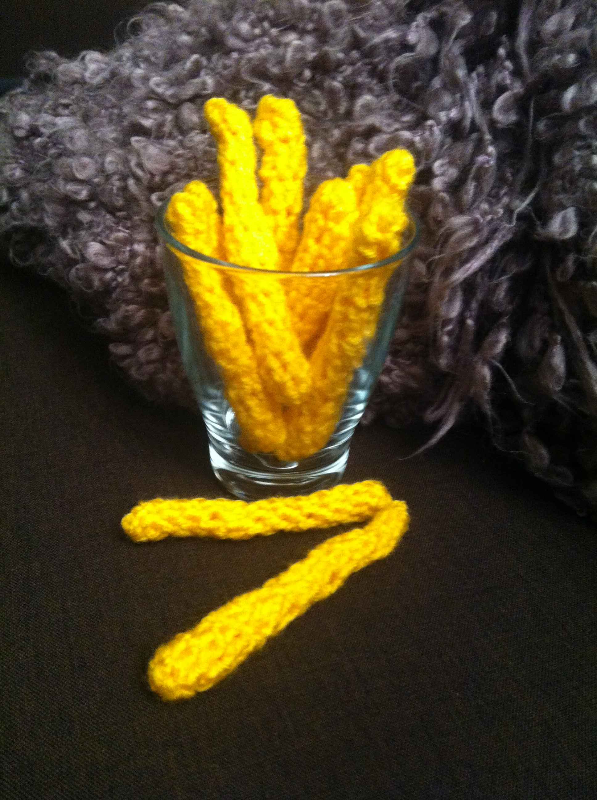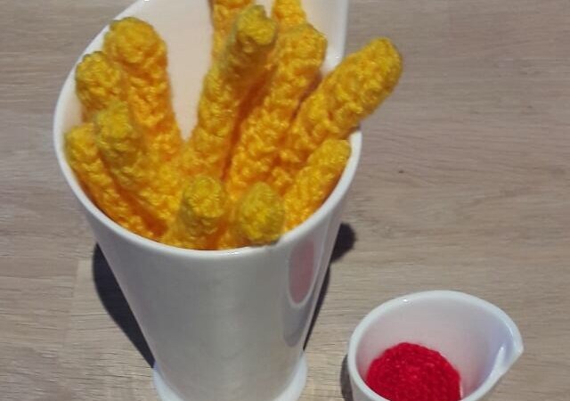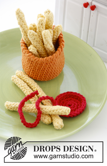 Gehäkelter Hot Dog mit Brot und Pommes frites in DROPS Paris