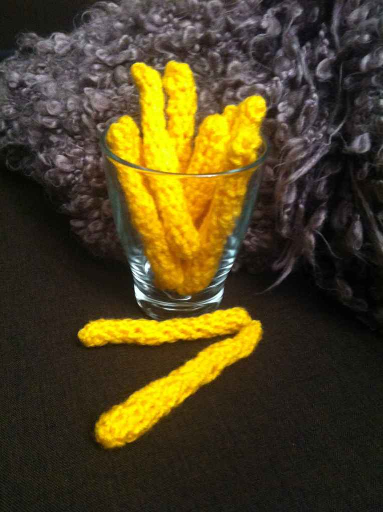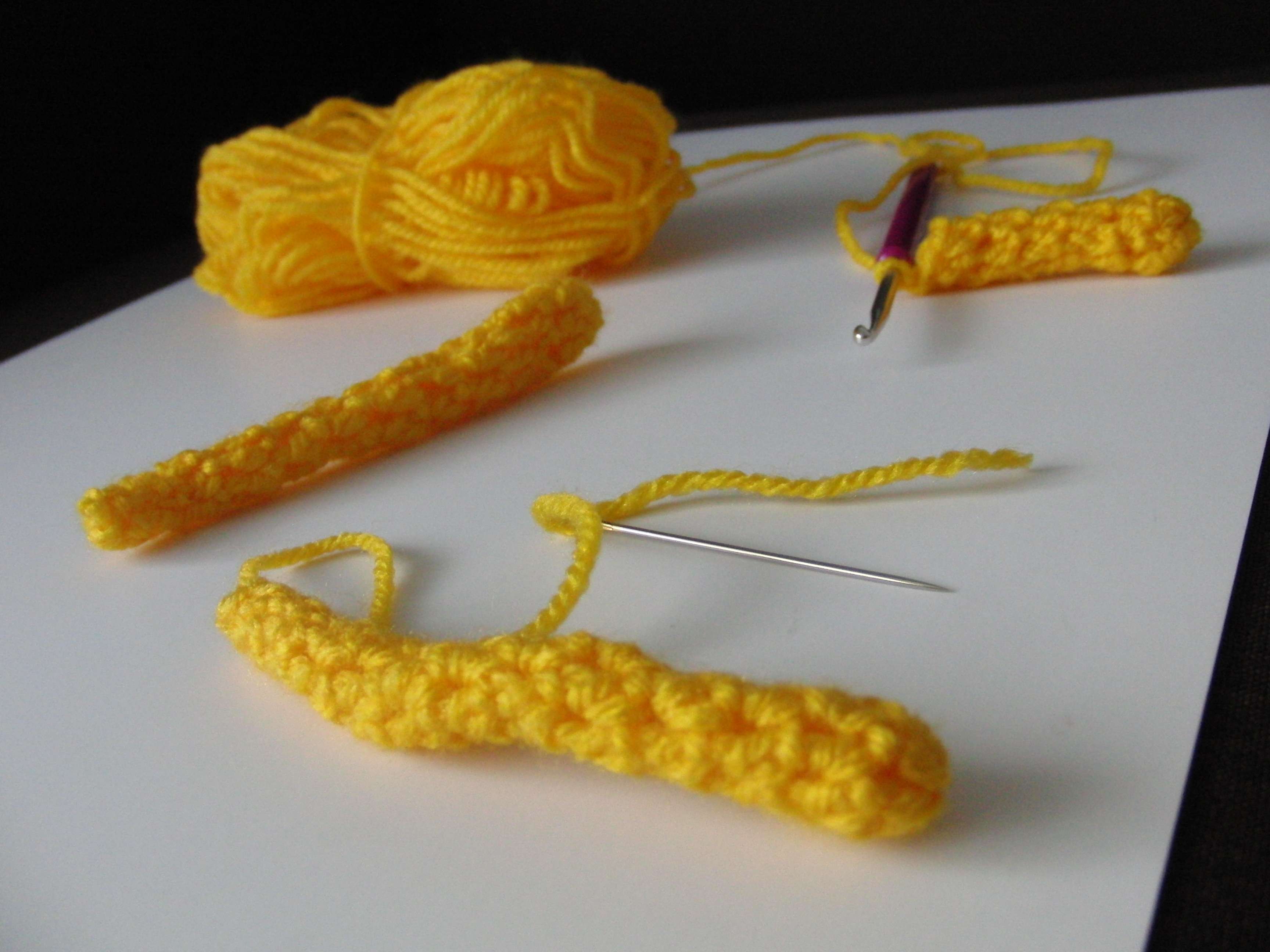 Neben Wolle in gelb und rot, brauchte ich noch eine Häkelnadel, eine Stopfnadel und eine Schere.