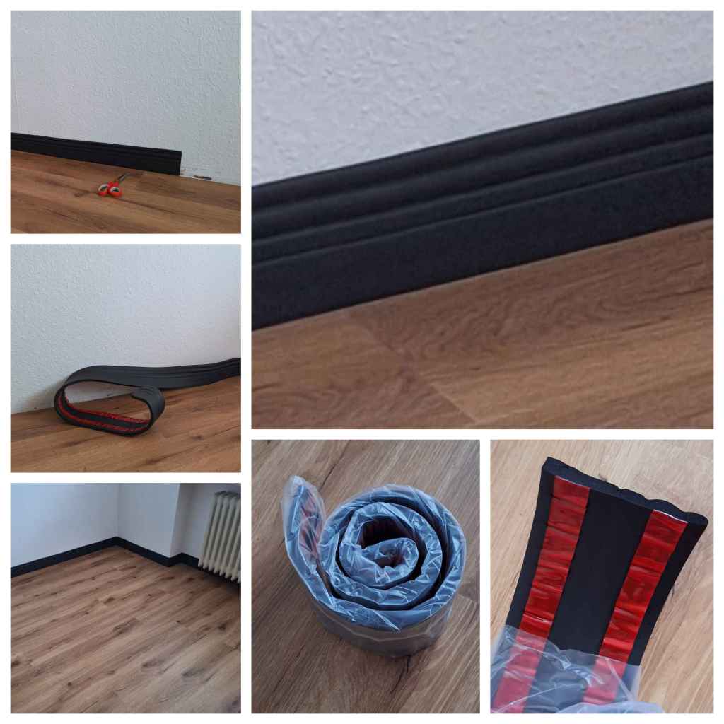 Ich fand ein tolles Modell. Schlicht und doch nicht glatt. Es kam aufgerollt an. Die roten Bänder mussten, nach und nach abgezogen werden und die Leisten an die Wand gedrückt werden. Bei Überlappungen konnte ich es mit einer normalen Schere durchschneiden.