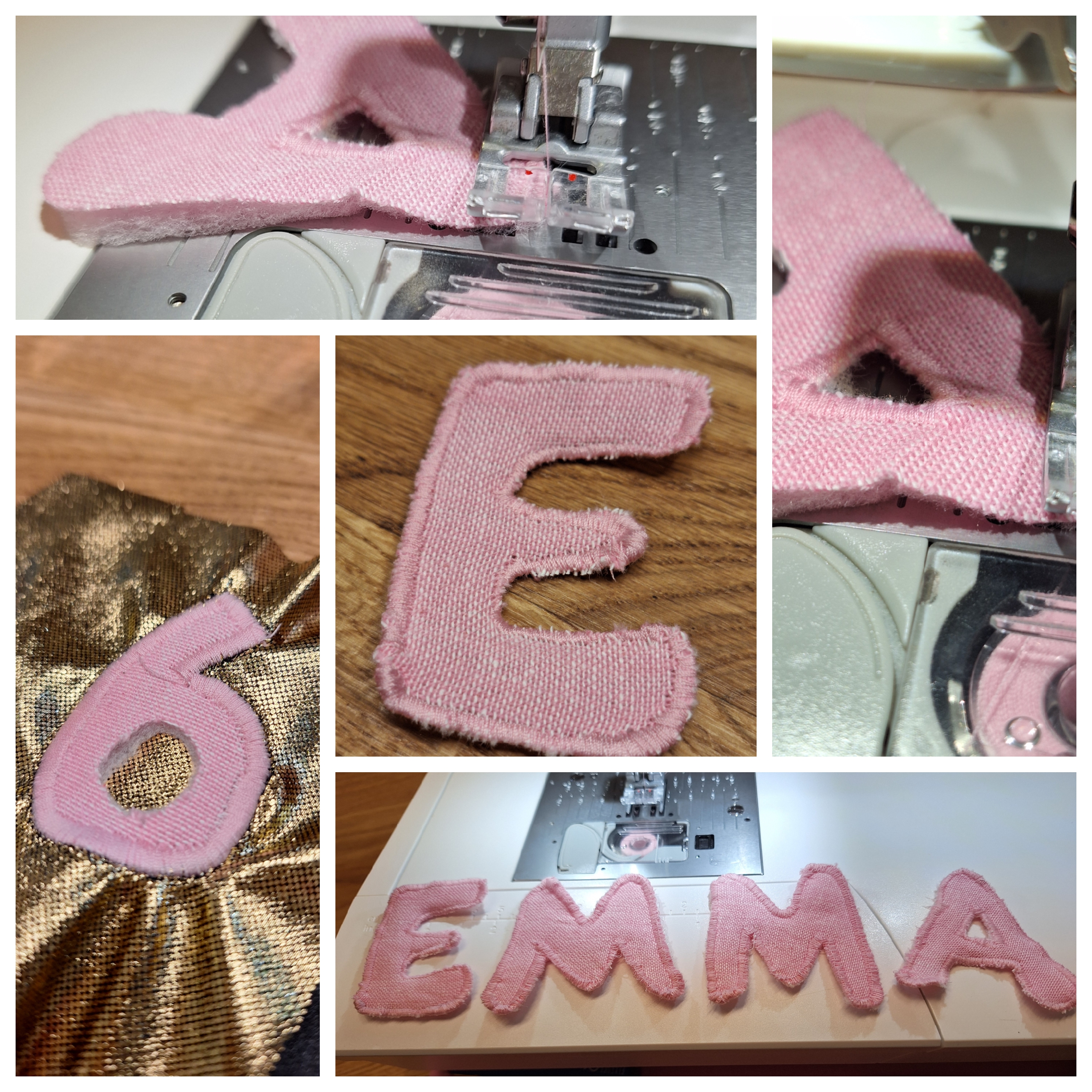 Also habe ich eine gute Schriftart ausgesucht (Comic Gecko Pro), die Buchstaben und die Zahl, aus dem, mit Vlies ausgestatteten rosa/pinknen Stoff ausgeschnitten und anschließend alle Teile mit einem engen ZickZack-Stich umrandet.