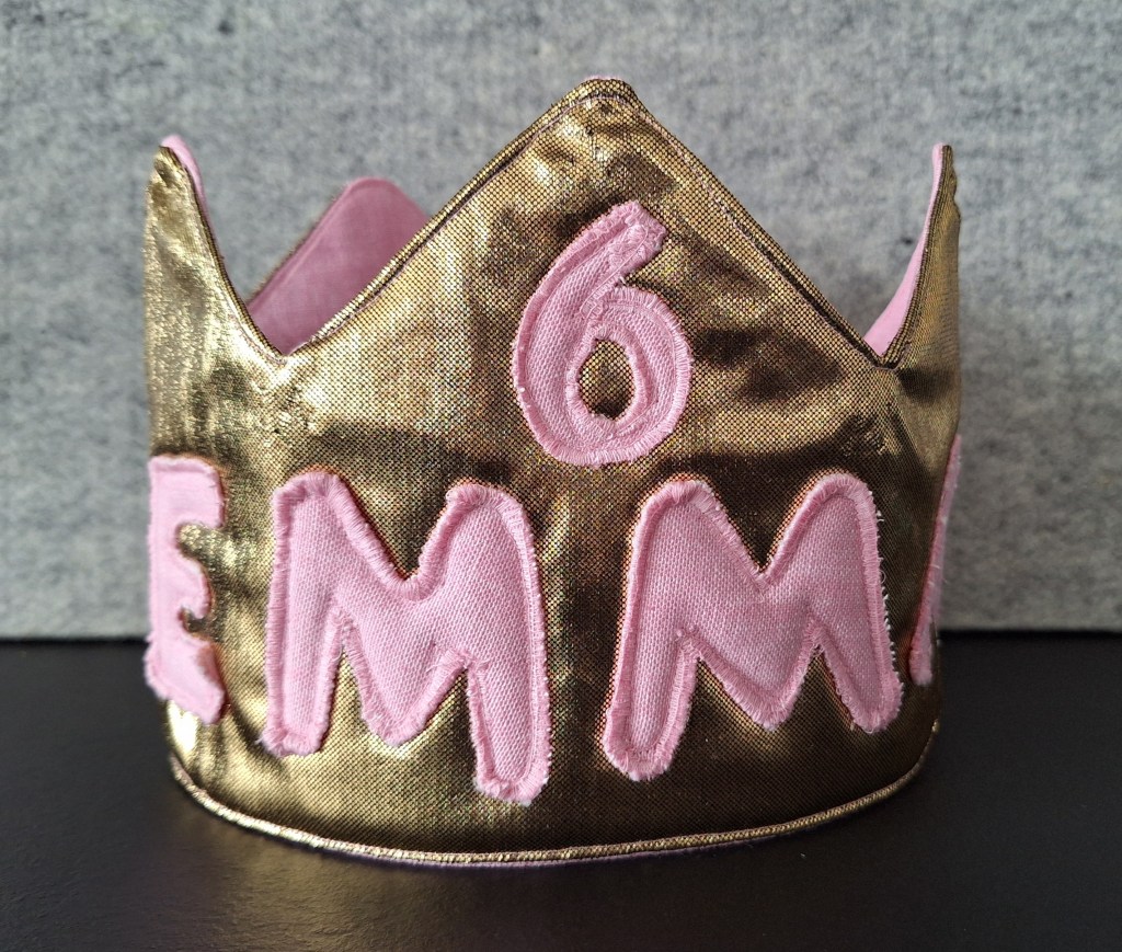 Zuvor hatte ich probiert, die Zahl direkt auf den goldenen Stoff aufzunähen (mit dem ZickZack-Stich). Da der Stoff sich zu arg zusammengezogen hat, kam eben Plan B zum Einsatz. Die Buchstaben einzeln umranden und dann mit normalem Stich an der Krone befestigen.