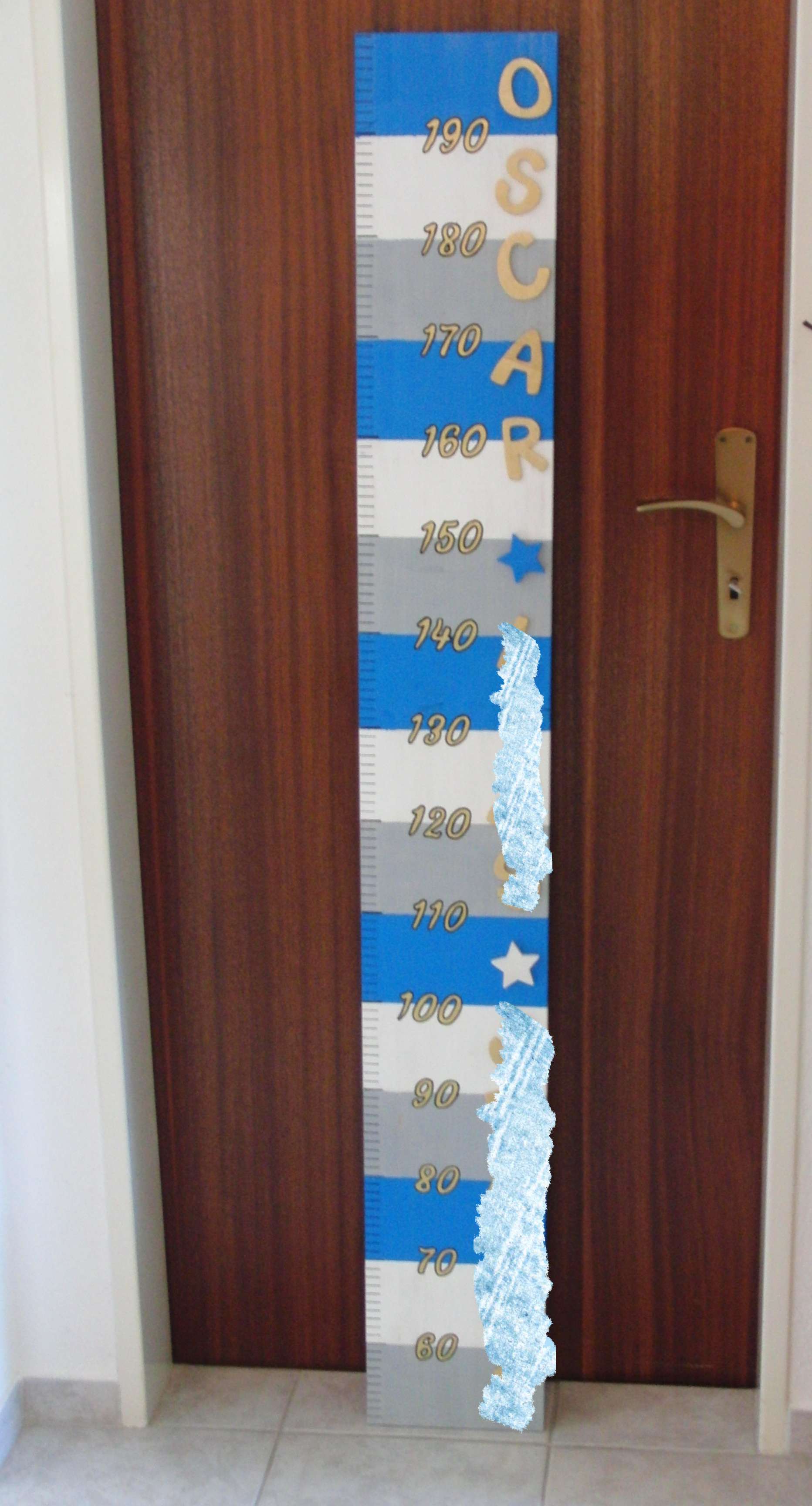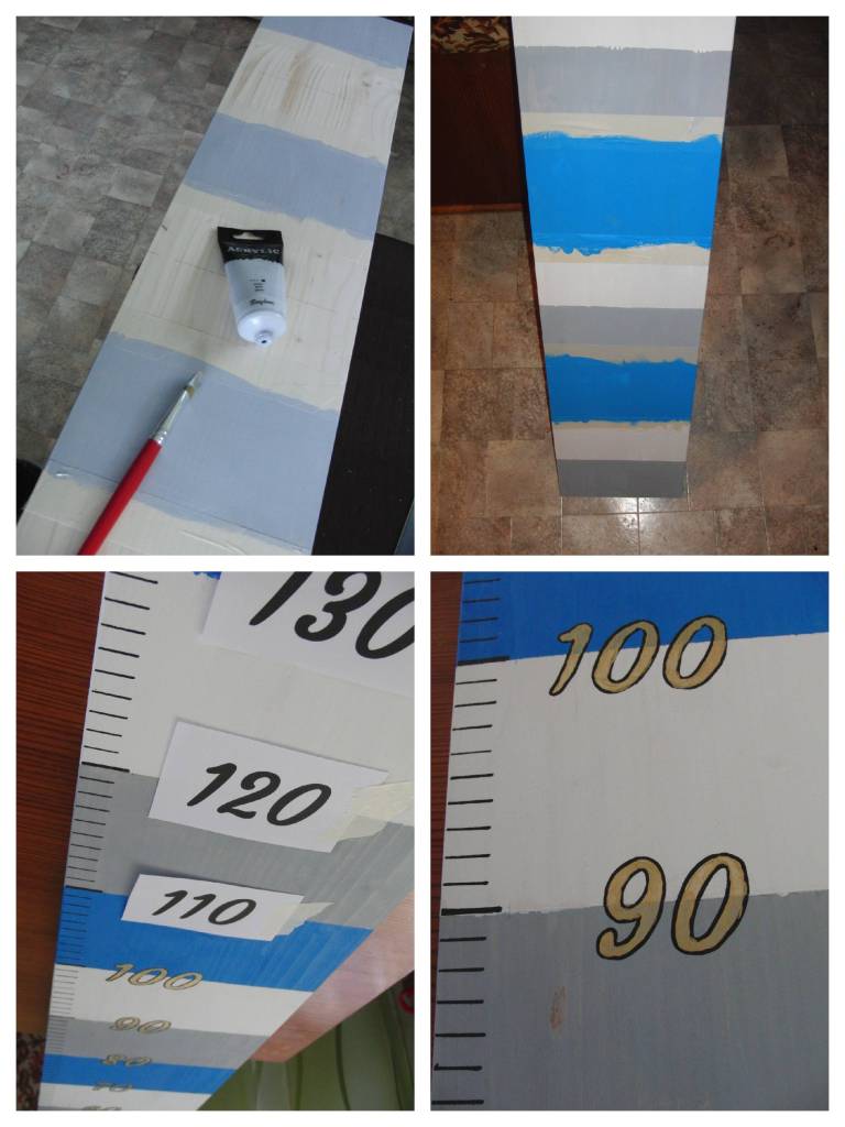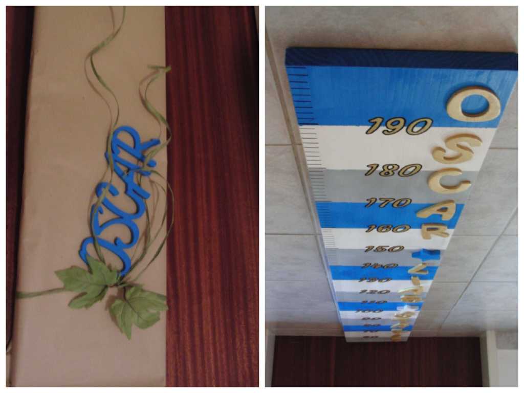 Ich habe an der Seite der Messlatte den ganzen Namen aus Holzbuchstaben gemacht und diese davor mit goldener Acrylfarbe angemalt.