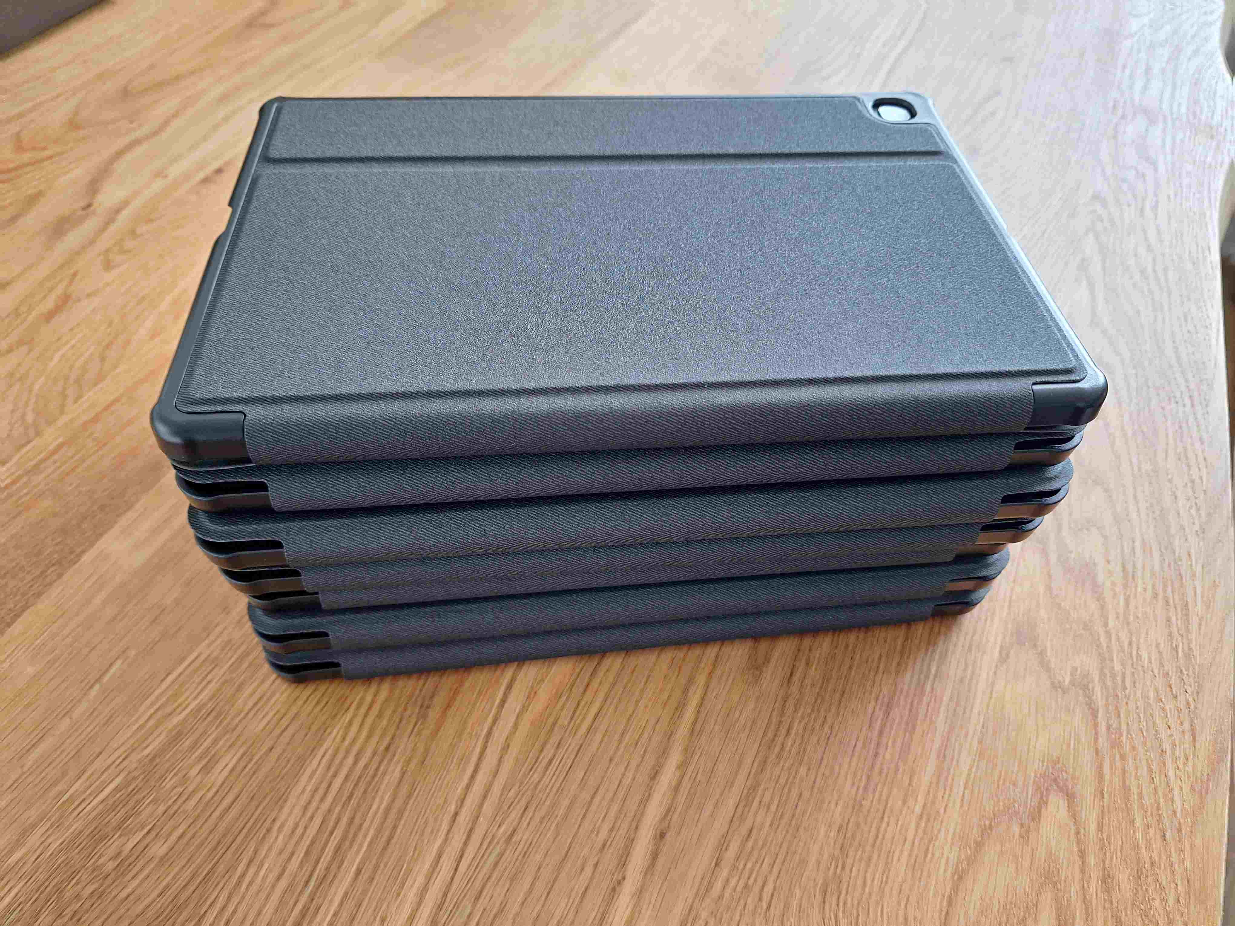 Das Anbringen auf den Hüllen ging relativ gut. Nur darf man nicht zu lange mit dem Bügeleisen draufbleiben, weil Plastik in den Tablet Hüllen drin ist. Nachdem die erste sich gleich mal etwas gebogen hat, habe ich bei den anderen, gleich nach dem Anpressen der Folie, so lange gerade gedrückt bis das Ganze abgekühlt war. Dies hat einen erheblichen Unterschied gemacht. Geschmolzen ist da nichts. Einstellung des Bügeleisens war am Anfang des zwei Punkte Bereichs und für die Dauer von ca. 15 Sekunden habe ich gepresst. Bei manchen ist ein leichter Bügeleisen – Abdruck zu sehen, der jedoch mit Sicherheit wieder verschwindet, weil es nur vom Druck kommt.