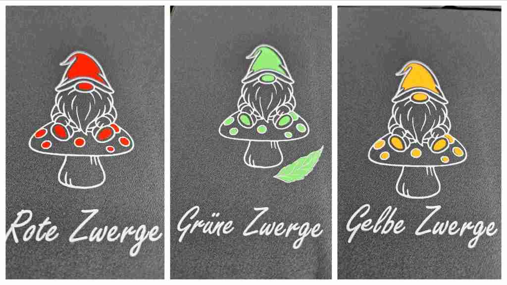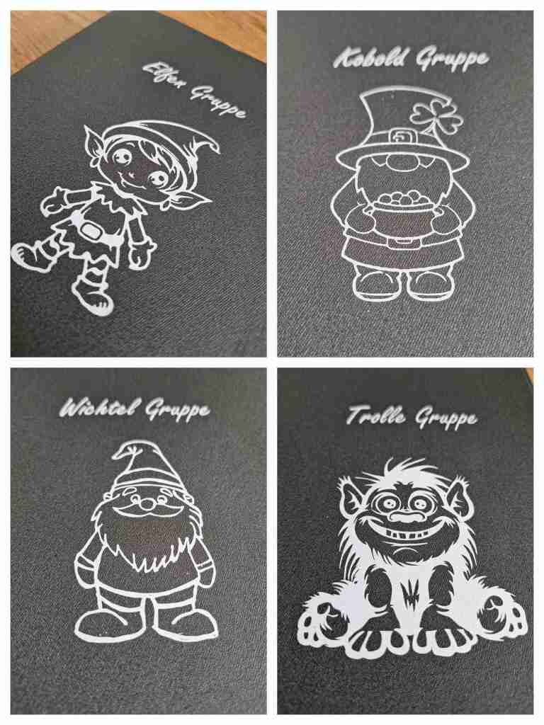 Für uns Zwerge (Krippenbereich), habe ich einen neuen Zwerg ausgesucht, den ich über etsy.de bekommen habe. Ich finde ihn voll süß. Ein bisschen Spielerei musste auch sein, daher habe ich durch ein Offset, die Mütze, die Schuhsohlen und die Punkte des Pilzes, in der Farbe des Gruppennamens dazugeplottet. Das grüne Blatt war eigentlich meine Probeplott – da ich nicht wusste, wie sich die Hülle der Tablets mit dem Bügeleisen vertragen.