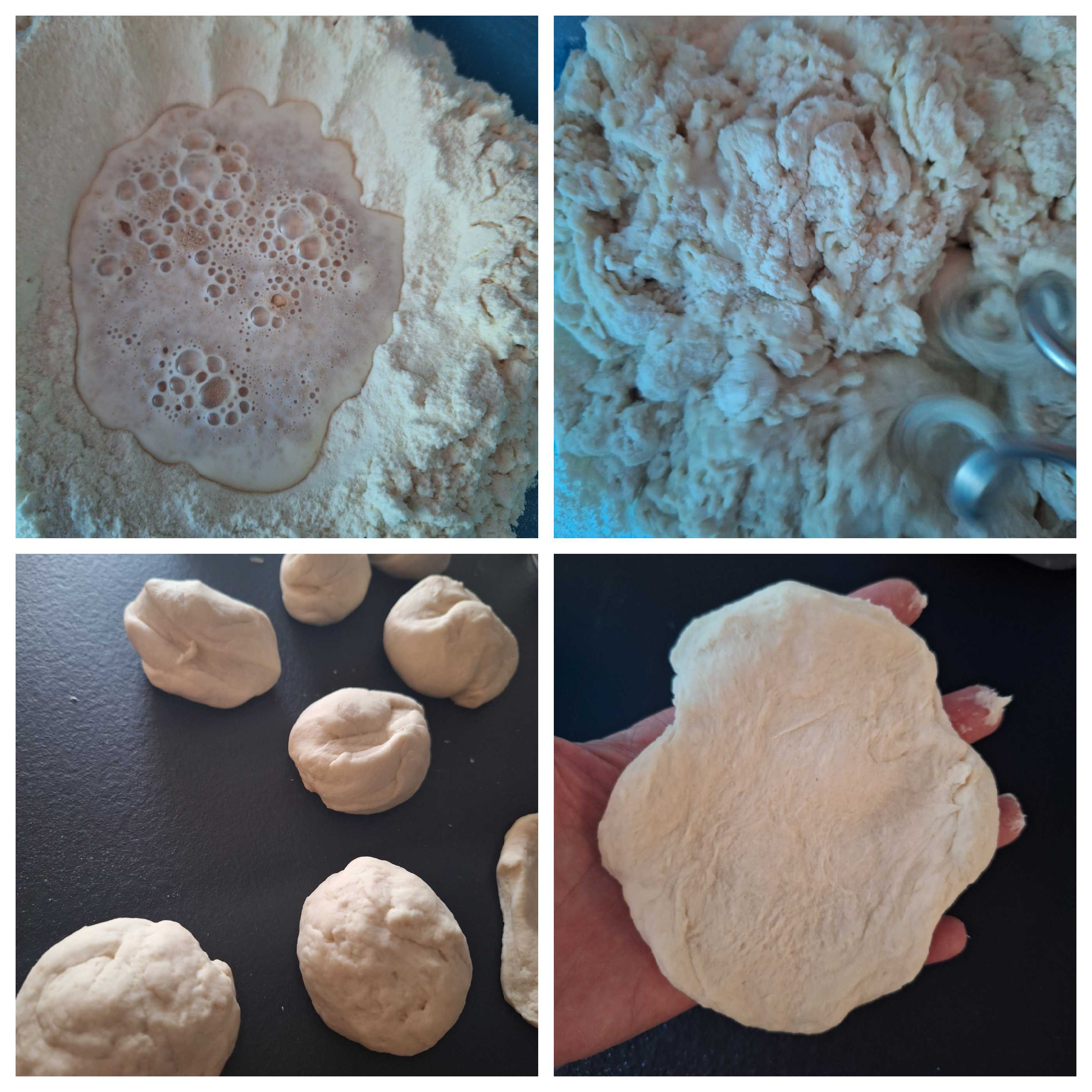 Alle trockenen Zutaten (Mehl, Salz, Zucker) werden vermischt, in einer Kuhle kommt die Trockenhefe dazu und das Milch/Wasser Gemisch zugeführt. Nach ein paar Minuten (Hefe beginnt zu arbeiten) alles mit einem Knethaken zu einem festen Teig mixen. Da es ein Hefeteig ist, kann man den Teig, dann abgedeckt etwas stehen lassen.