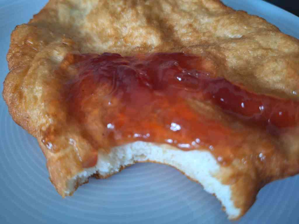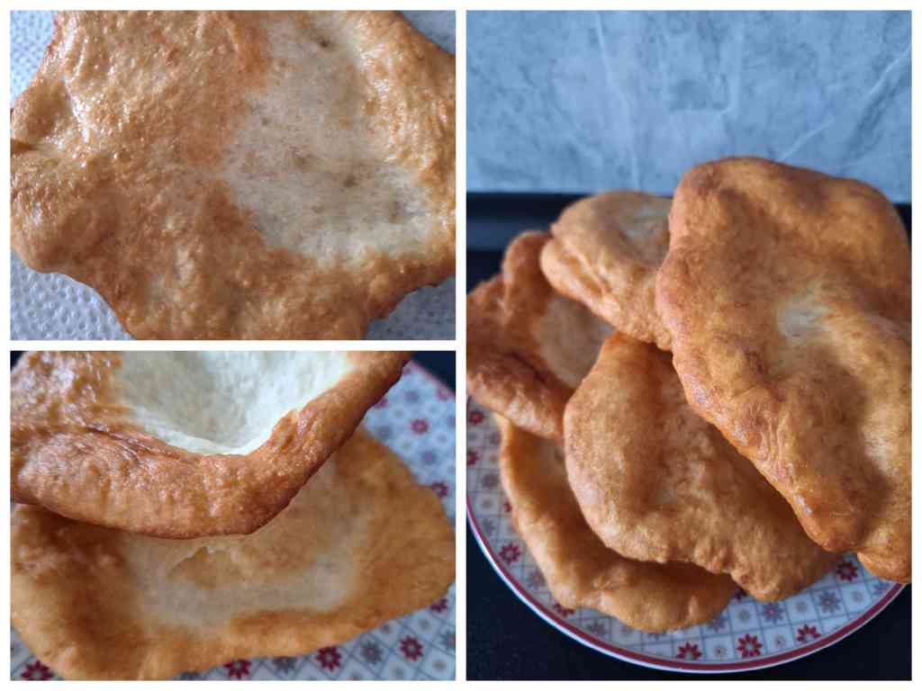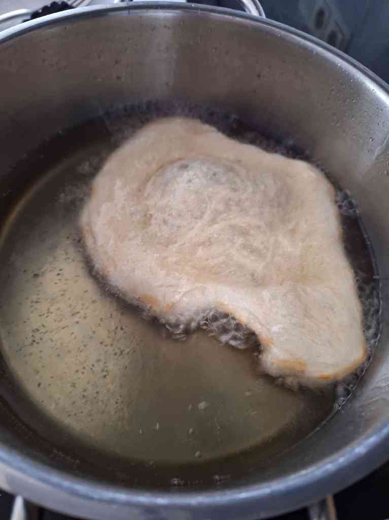 Währenddessen in einem breiten Topf, das Öl erhitzen. Der Teig wird in gleichgroße Teile geteilt. Wenn das Öl soweit ist, den Teig zu einem Fladen auseinanderziehen und ins Öl gleiten lassen.