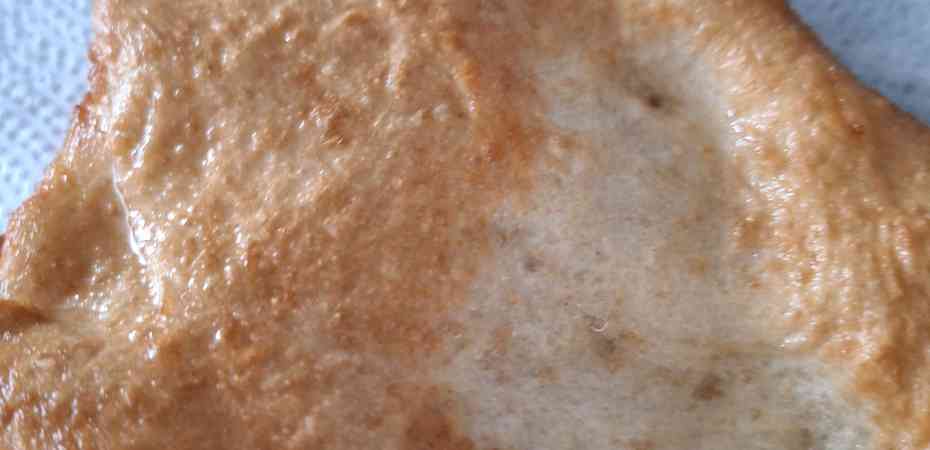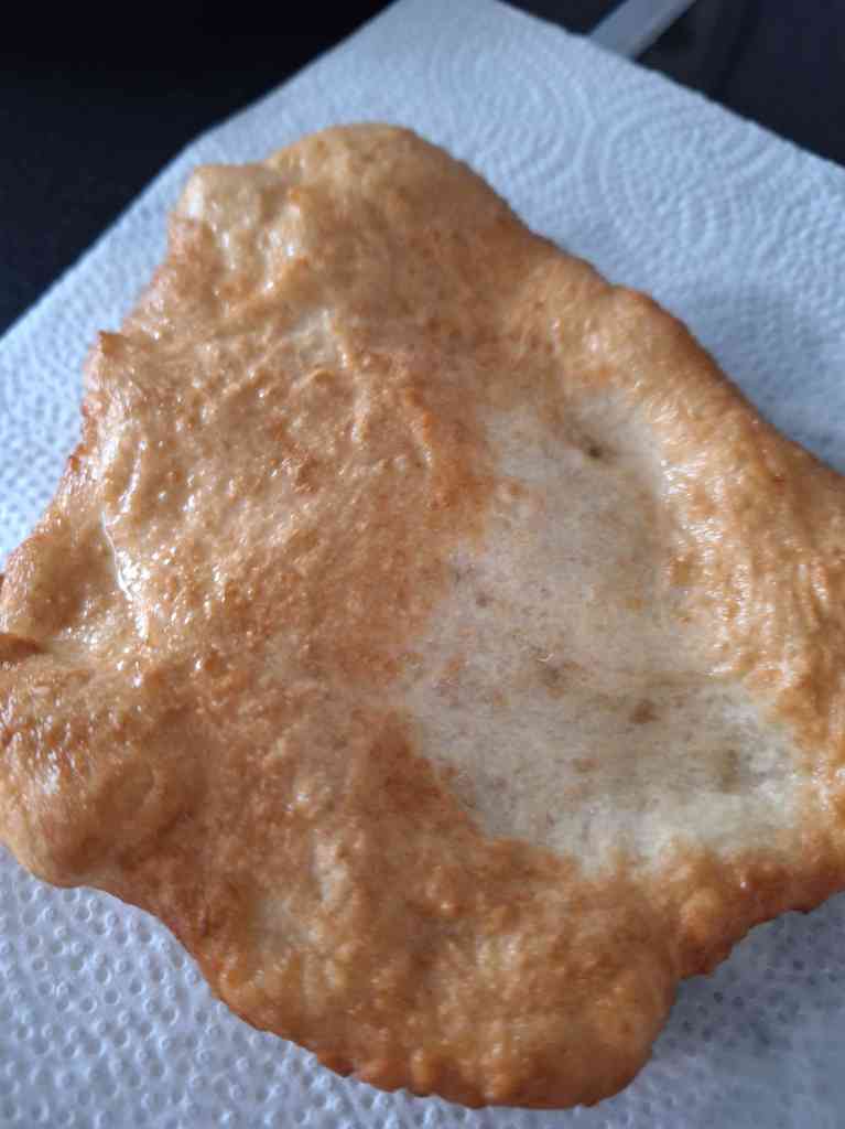 An den Rändern des Langoschs, kann man gut erkennen, wie weit das Ausbacken ist. Goldbraun ist das Ziel. Wenn es soweit ist, den Fladen wenden. Danach sind sie fertig. Auf einem Küchenpapier, kann das überschüssige Öl aufgefangen werden.