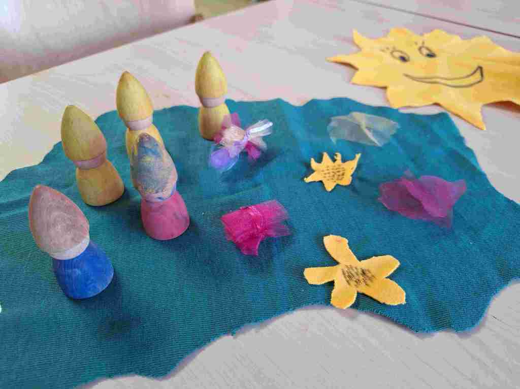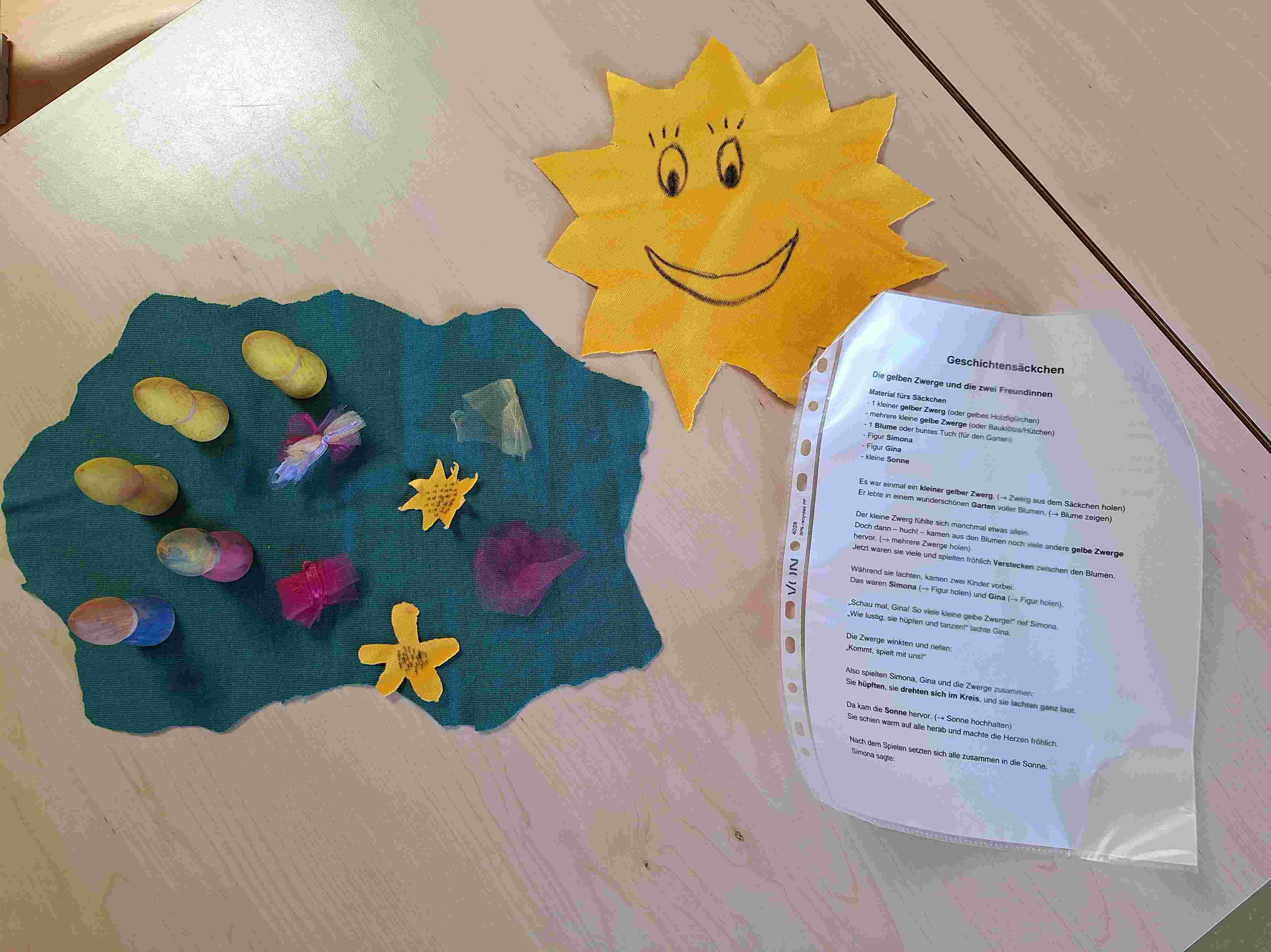 „Ein kleiner gelber Zwerg lebt in seinem Blumengarten und fühlt sich manchmal etwas allein. Da springen weitere gelbe Zwerge aus den Blumen heraus. Gemeinsam haben sie viel Spaß zusammen. Zwei Kinder kommen an ihnen vorbei (sie tragen die Namen der Erzieherinnen) und werden eingeladen mitzuspielen und mitzutanzen. Zwischendrin kommt die Sonne raus und sie genießen die Strahlen. Zum Schluss merken sie alle: Gemeinsam ist es am schönsten! „
