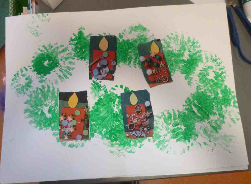 Damit ich später noch wusste, welches Kind, welche Kerze gelegt hatte – hatte jedes Kind ein Schildchen mit dem Namen daneben, was mit aufs Foto kam. Beim Bearbeiten habe ich es dann ausgeschnitten und mir notiert, wem welches gehört. Da ich die Bilder diesmal ausgedruckt habe, musste ich mir das natürlich richtig gut notieren. Anschließend haben die Kinder, die Kerzen ausgeschnitten und auf ihren gedruckten / gemalten Adventskranz geklebt. Dieses Jahr gibt es für das Portfolio, eine Weihnachtszeitcollage. Beim letzten Mal, hatte ich da die einzelnen Kerzen aufgenommen.