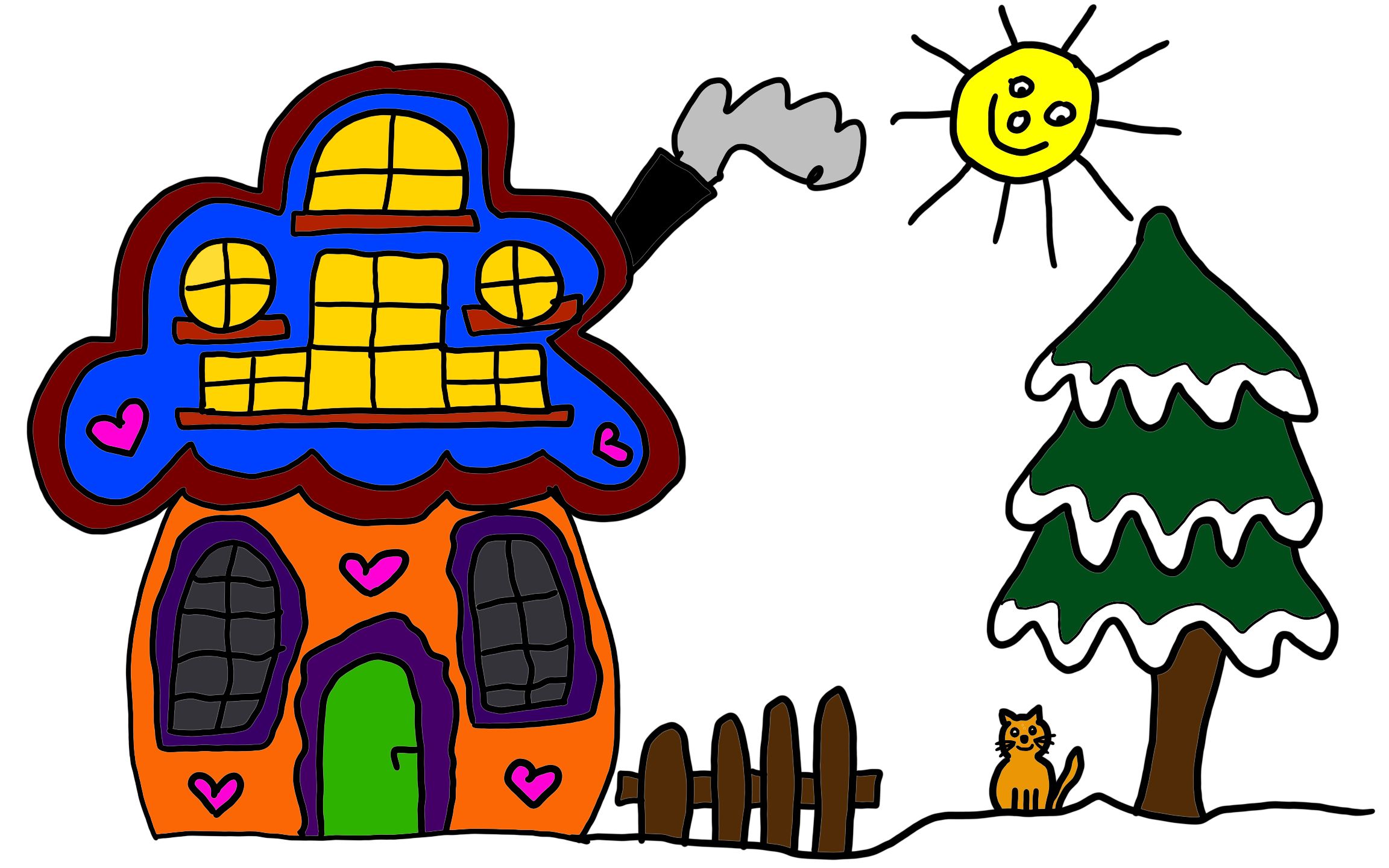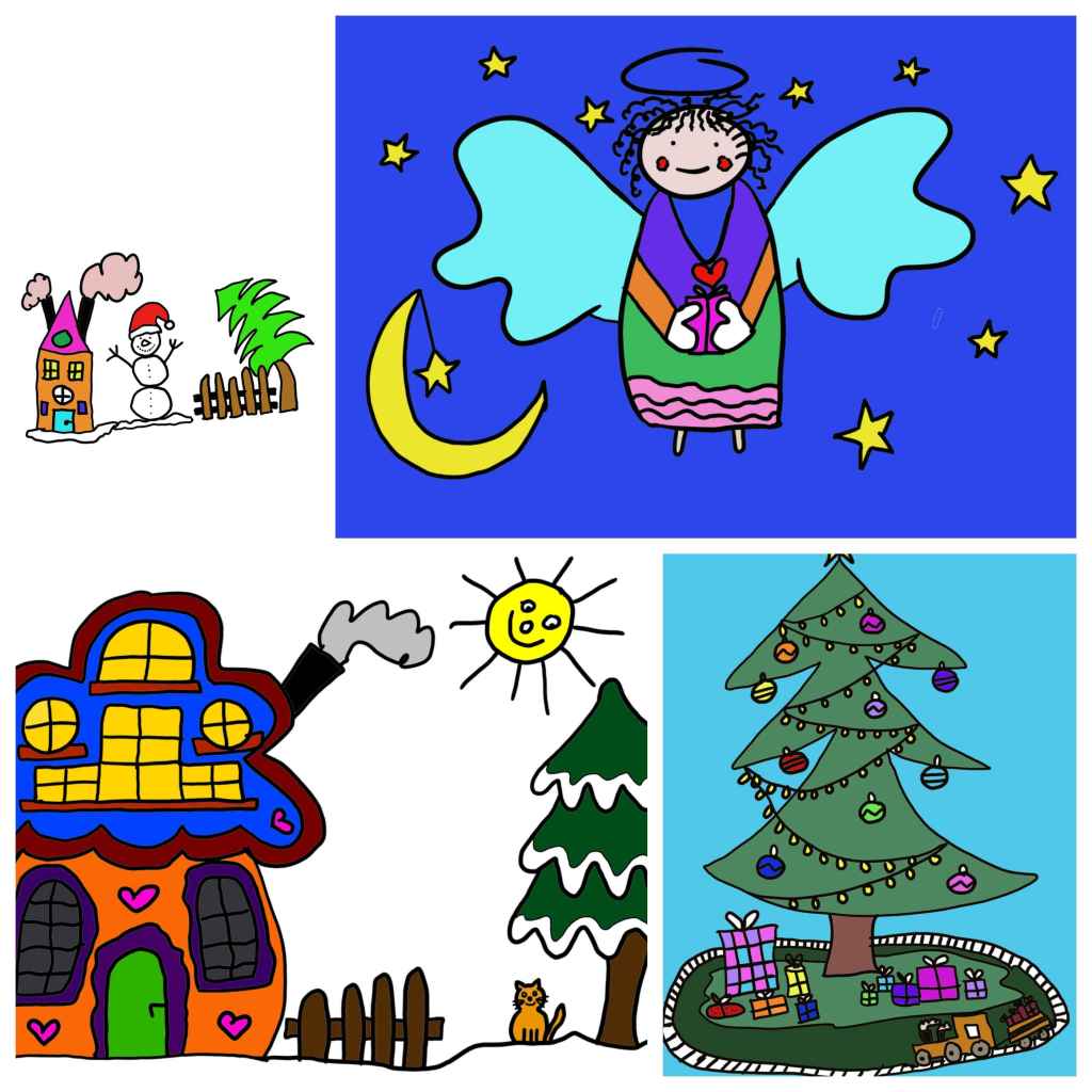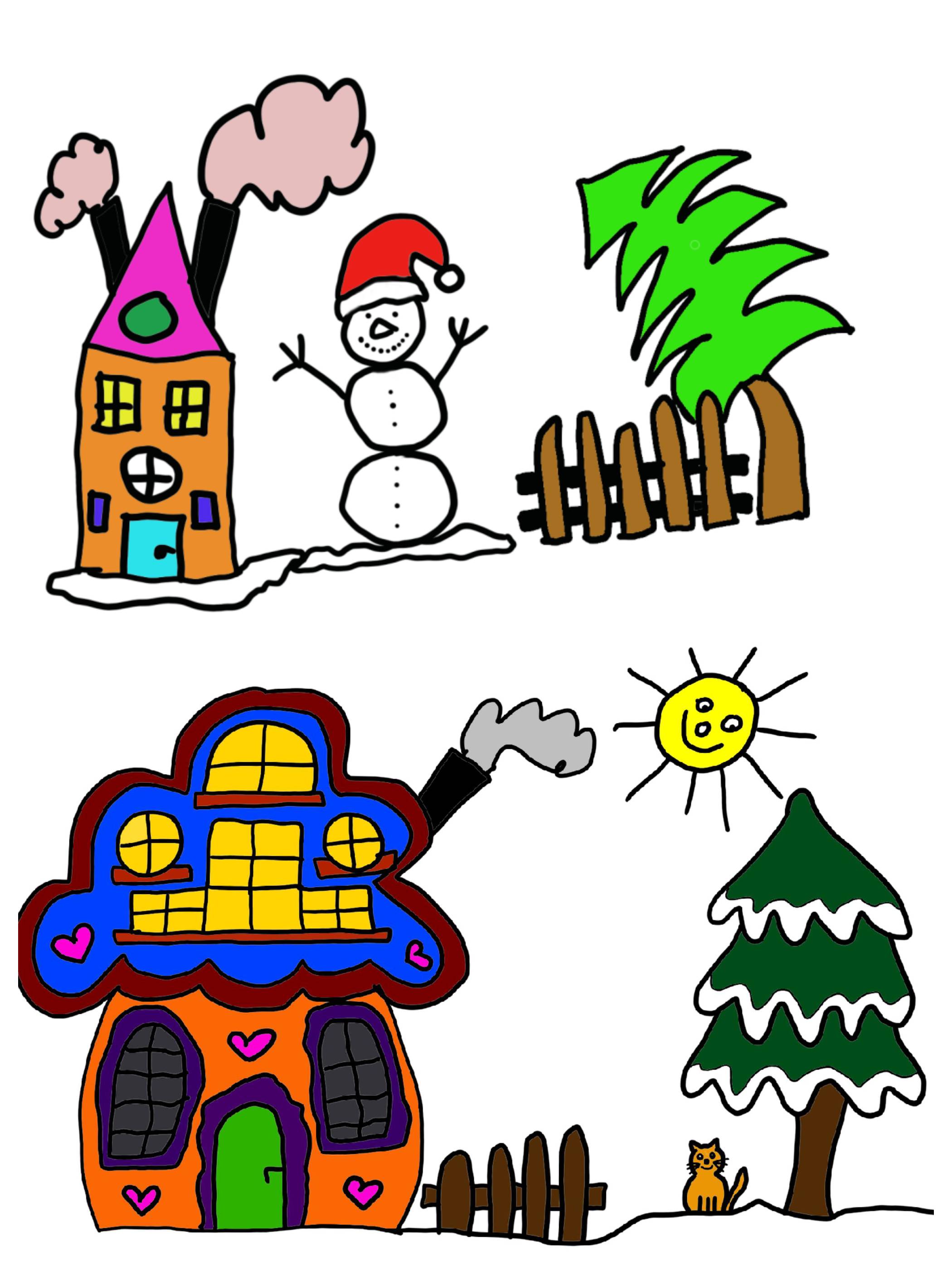 Hier habe ich mich für eine Landschaft entschieden und habe mich an zwei der Bildern bedient. So kamen ein Haus, die Tanne und der Schneemann zusammen.