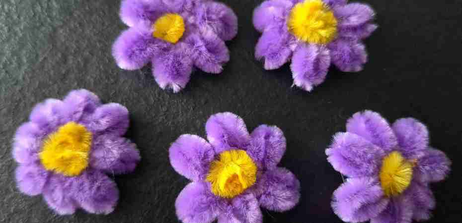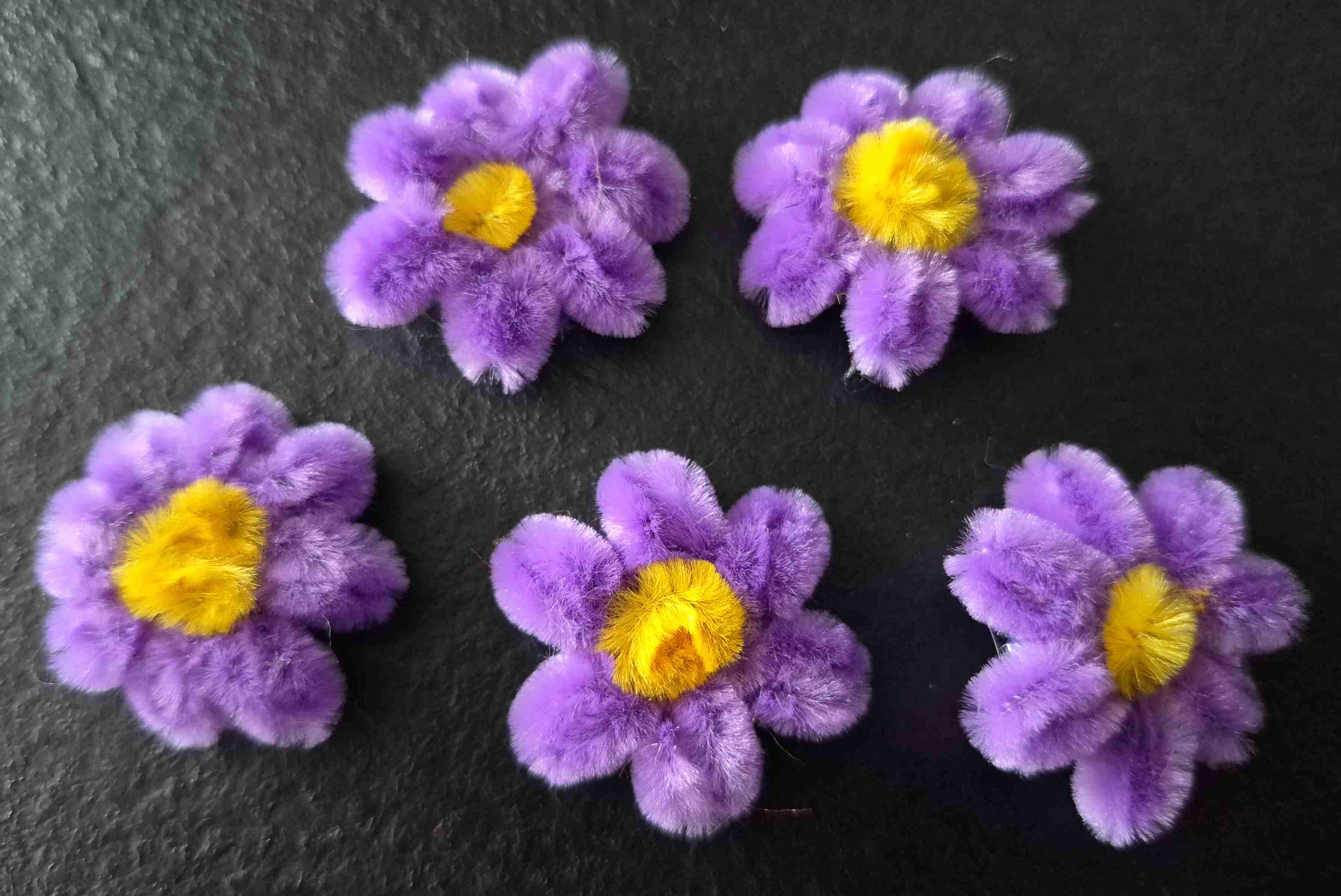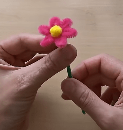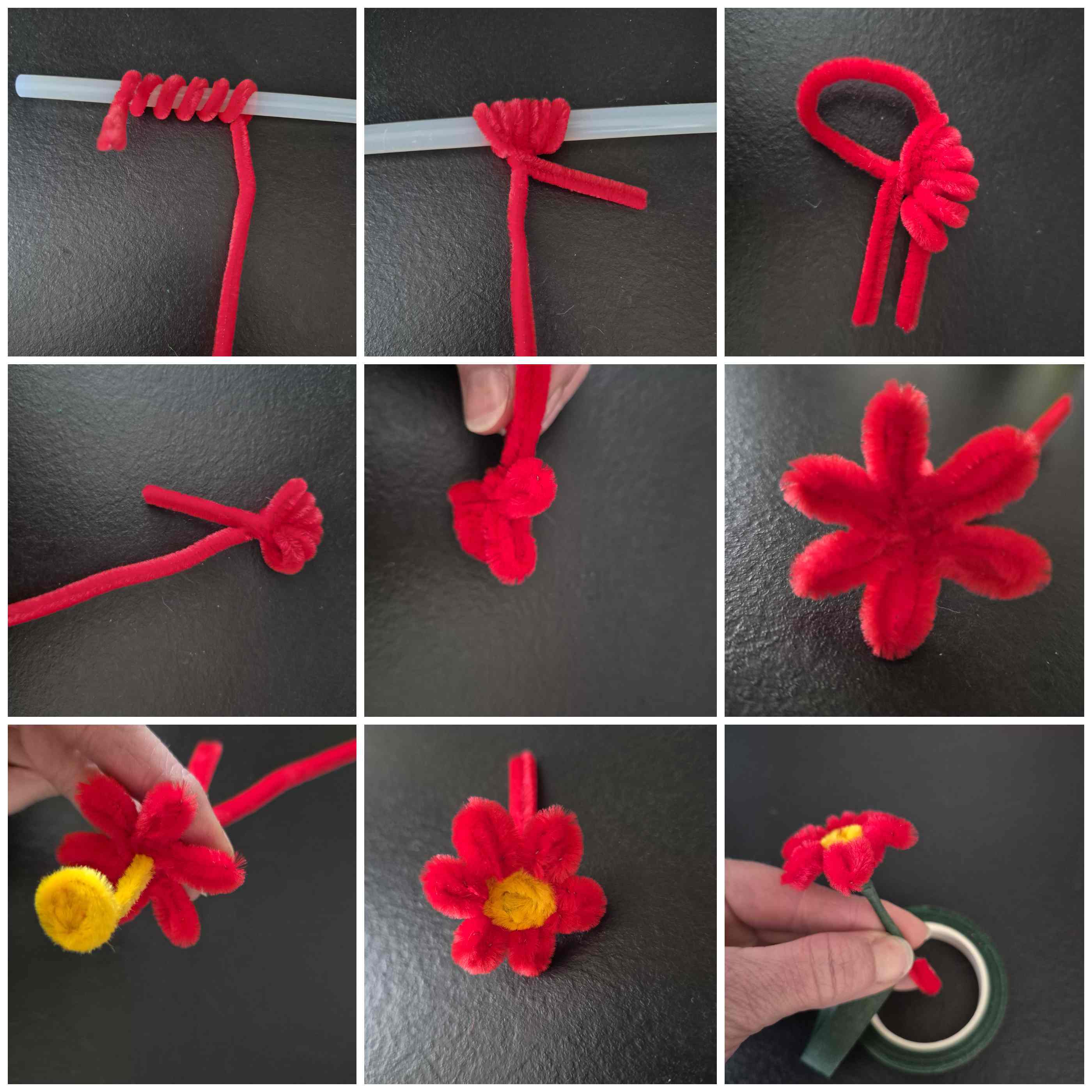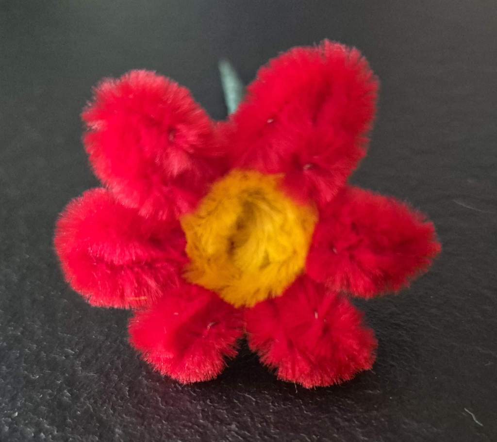 Man kann bei der Blumenmitte, ein Stückchen von dem gelben Pfeifenreiniger eindrehen und so durchziehen wie ich es gemacht habe, oder abknipsen (Zange) und mit Heißkleber fixieren.