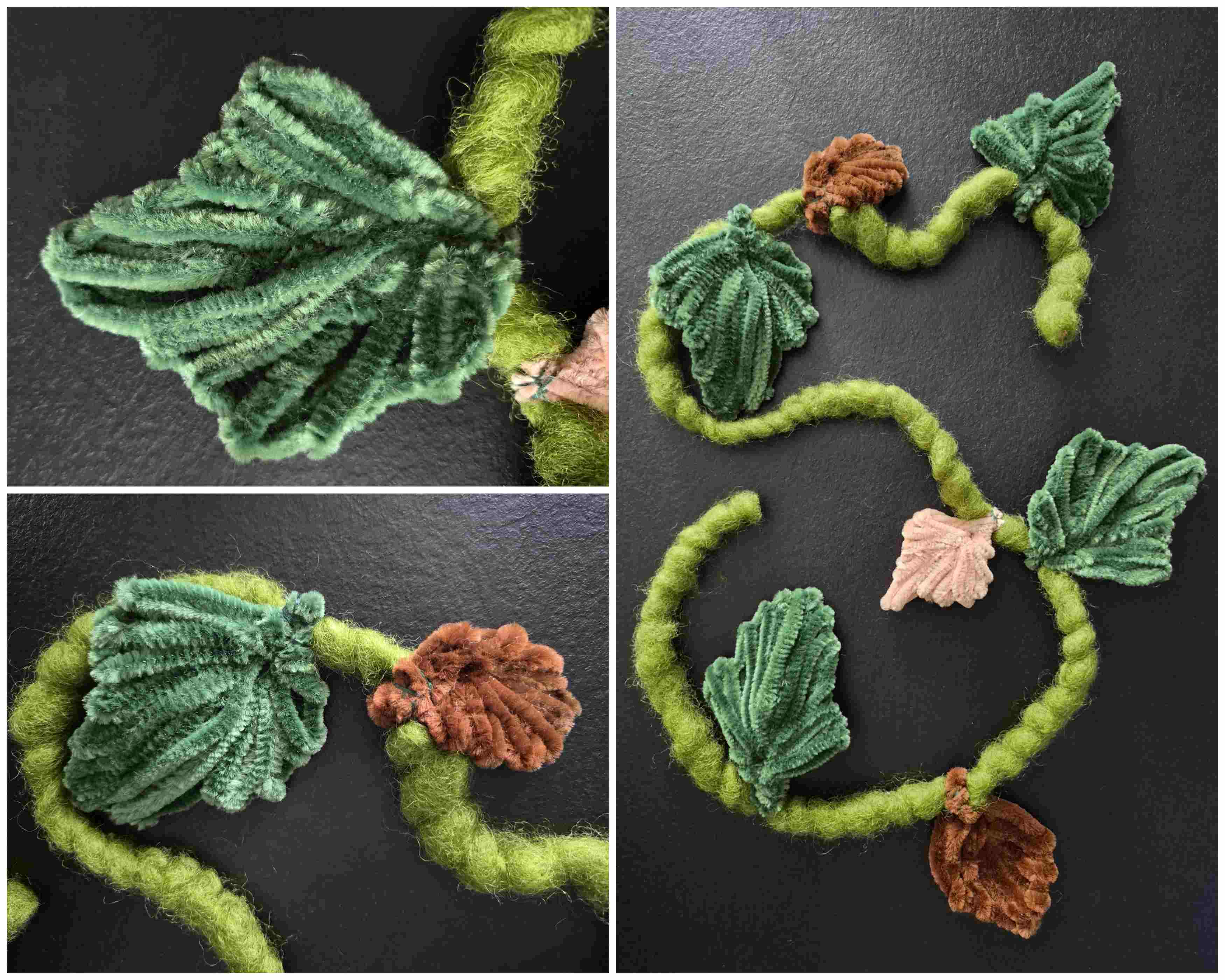 Für das Geschichtensäckchen „Kürbis Kiki und das Erntedankfest“ brauchte ich noch eine Ranke mit Blättern für das Kürbisfeld. Ich hatte noch eine besondere Filzschnur, die prima dazu geeignet war – doch nun mussten Blätter her. Erst dachte ich an Filz, bin aber irgendwann auf die Pfeifenreiniger gestoßen.