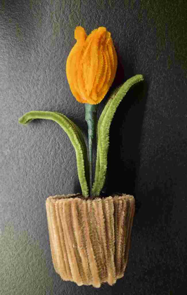 Der Blumentopf ist fertig (hier geht´s zum Entstehungsbeitrag: „Pfeifenputzer Nr.6: Blumentopf„) und die Tulpe wurde bereits eingepflanzt. Was sagt ihr?
