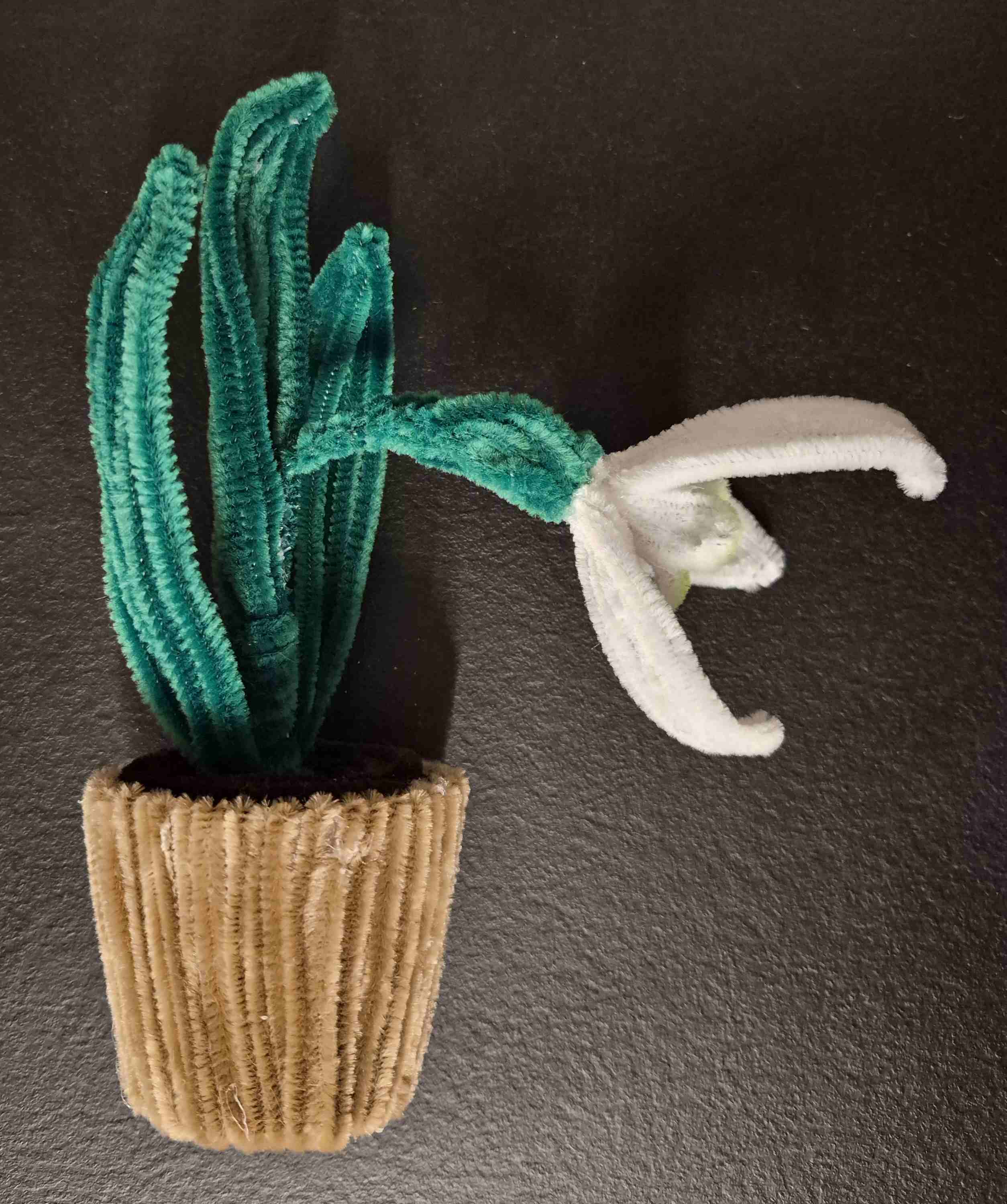 Hier ist nun der erste fertige Topf und das Schneeglöckchen durfte hineinhüpfen. Zur Entstehung des Topfes, schaut euch den Beitrag an: „Pfeifenputzer Nr. 6 – Ein Blumentopf“ an.