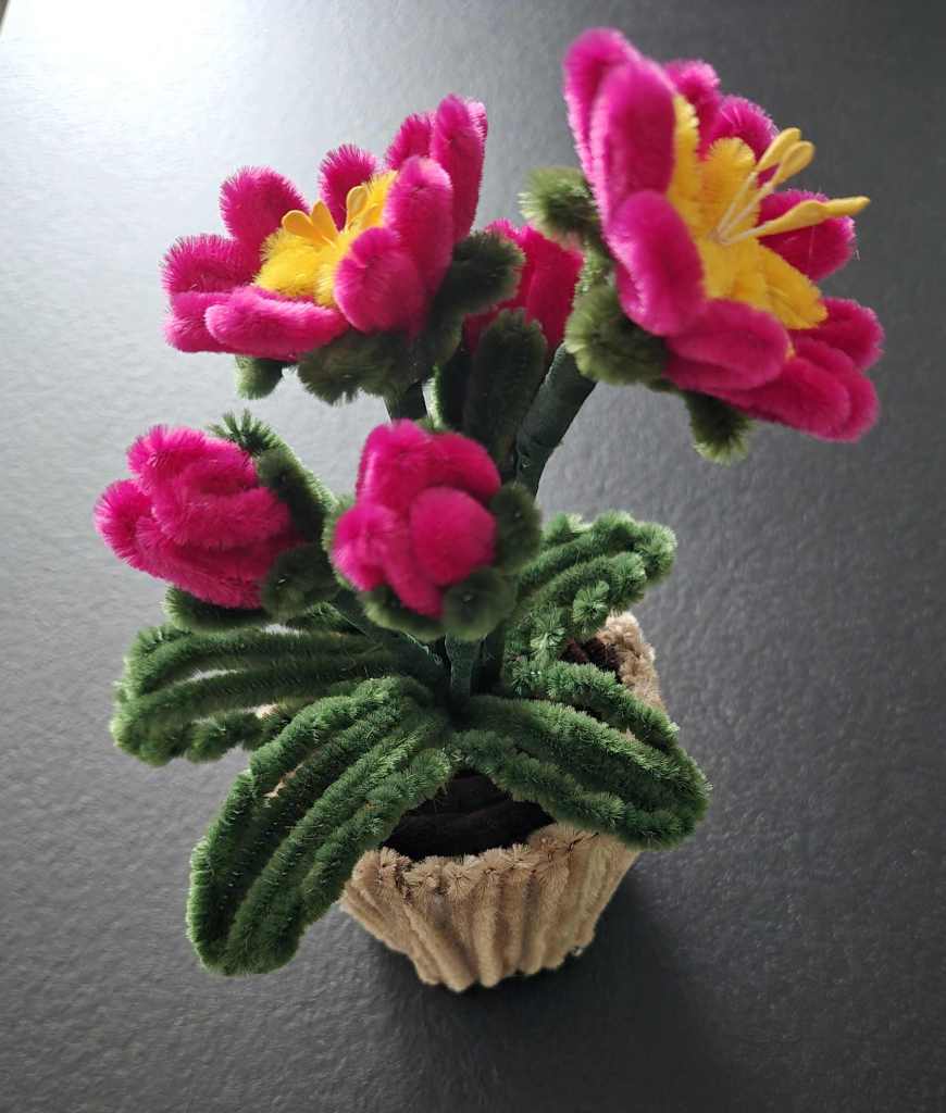 Das Zusammenfügen war etwas knifflig, da mein Blumendraht sehr stabil ist und sich nicht so leicht biegen lässt. Ich muss mal schauen ob ich eine Alternative finde. Dennoch habe ich eine gute Kombination der Blüten und Knospen gefunden und ein tolles Primelpflänzchen (mit Hilfe des Floristenbandes) gezaubert.