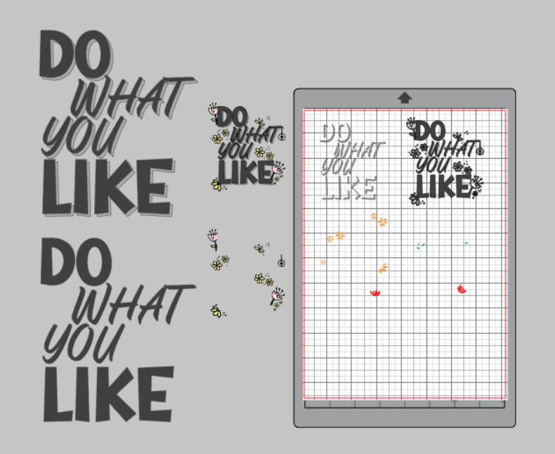 So sah übrigens das aufgebröselte Bild aus – Plotts in schwarz, grau, gelb, rosa, grün. Vor dem Schneiden noch schön gespiegelt, da ich tatsächlich mit Flexfolie gearbeitet habe, denn: „Wer bügeln will – muss spiegeln!“ – alte Plotterweisheit.