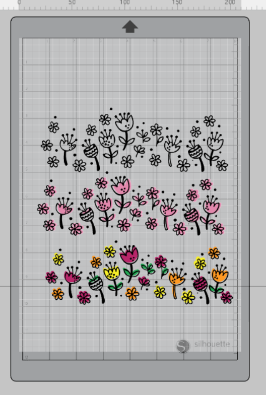 So sah übrigens das aufgebröselte Bild aus – Plotts in schwarz, grau, gelb, rosa, grün. Vor dem Schneiden noch schön gespiegelt, da ich tatsächlich mit Flexfolie gearbeitet habe, denn: „Wer bügeln will – muss spiegeln!“ – alte Plotterweisheit.